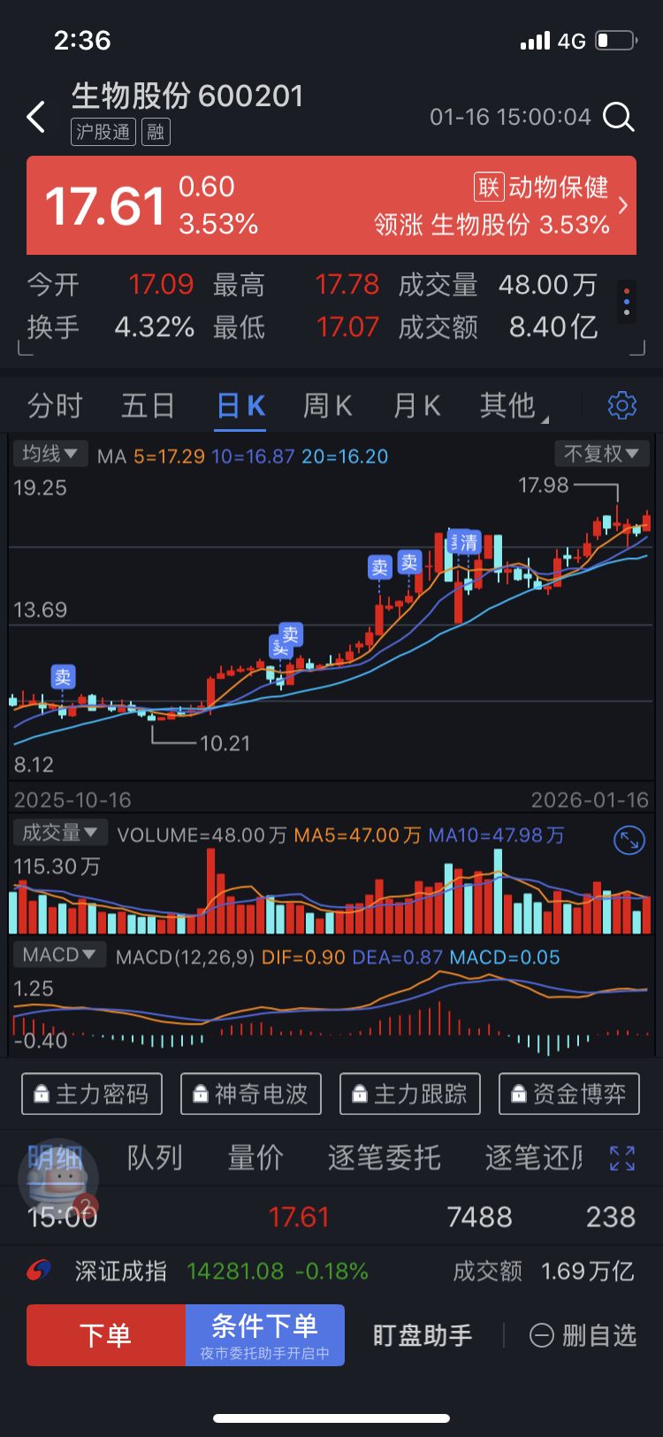$生物股份(SH600201)$ 目前16.98元已经突破并站稳,压力位变支撑位。回16.98元重新建仓。
