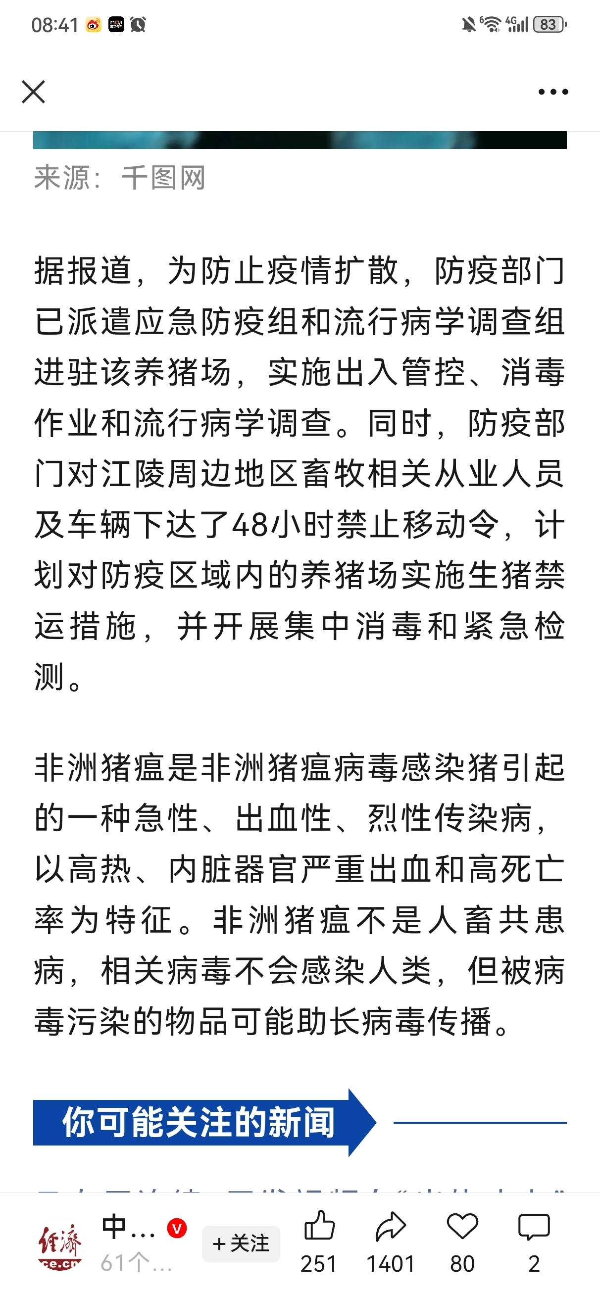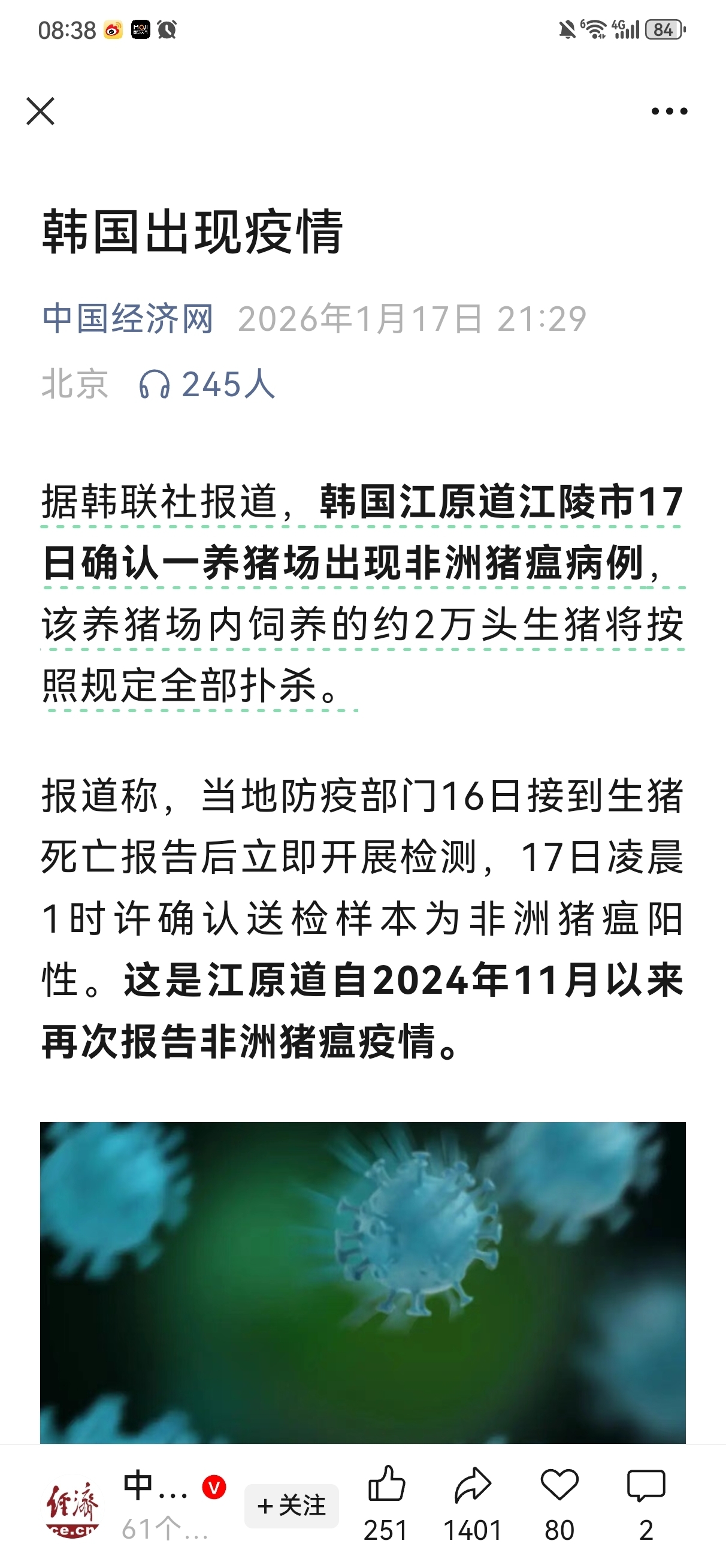 周六晚间“中国经济网”官媒报道,韩国出现非洲猪瘟,扑杀两万头生猪,目前阅读量已超