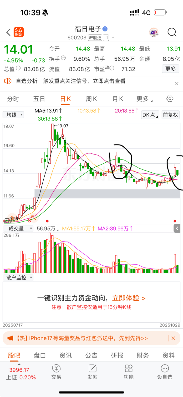 $福日电子(SH600203)$ 吓死个人了,同样的线一摸样