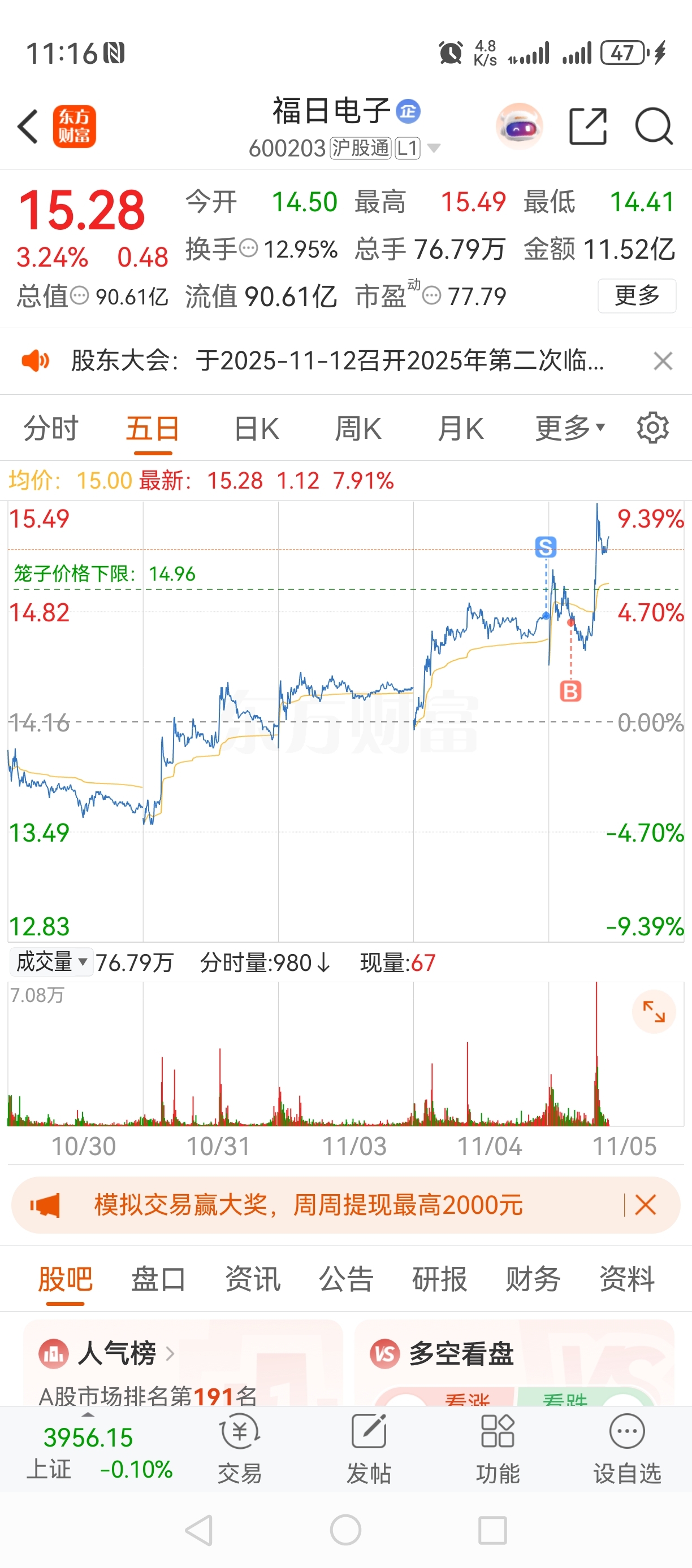 $福日电子(SH600203)$ 昨天尾盘卖了就后悔,今天水下又接回来了!感觉要来第二波行情了!