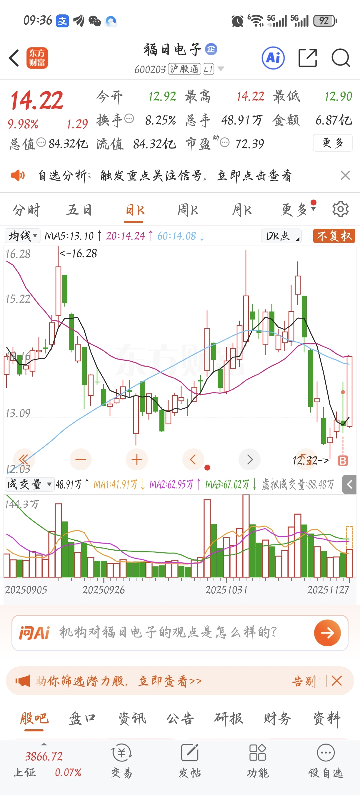 $福日电子(SH600203)$ 昨天全仓被挂树上,我就感觉你小子有潜力,没让我失望