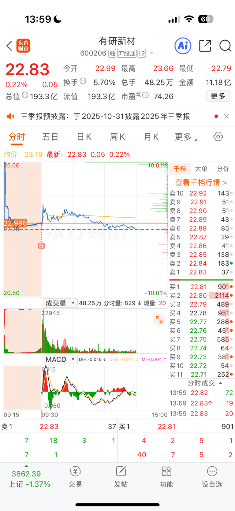 $有研新材(SH600206)$ 明天不涨就撤了,今早开盘这么好,都走成这个样子