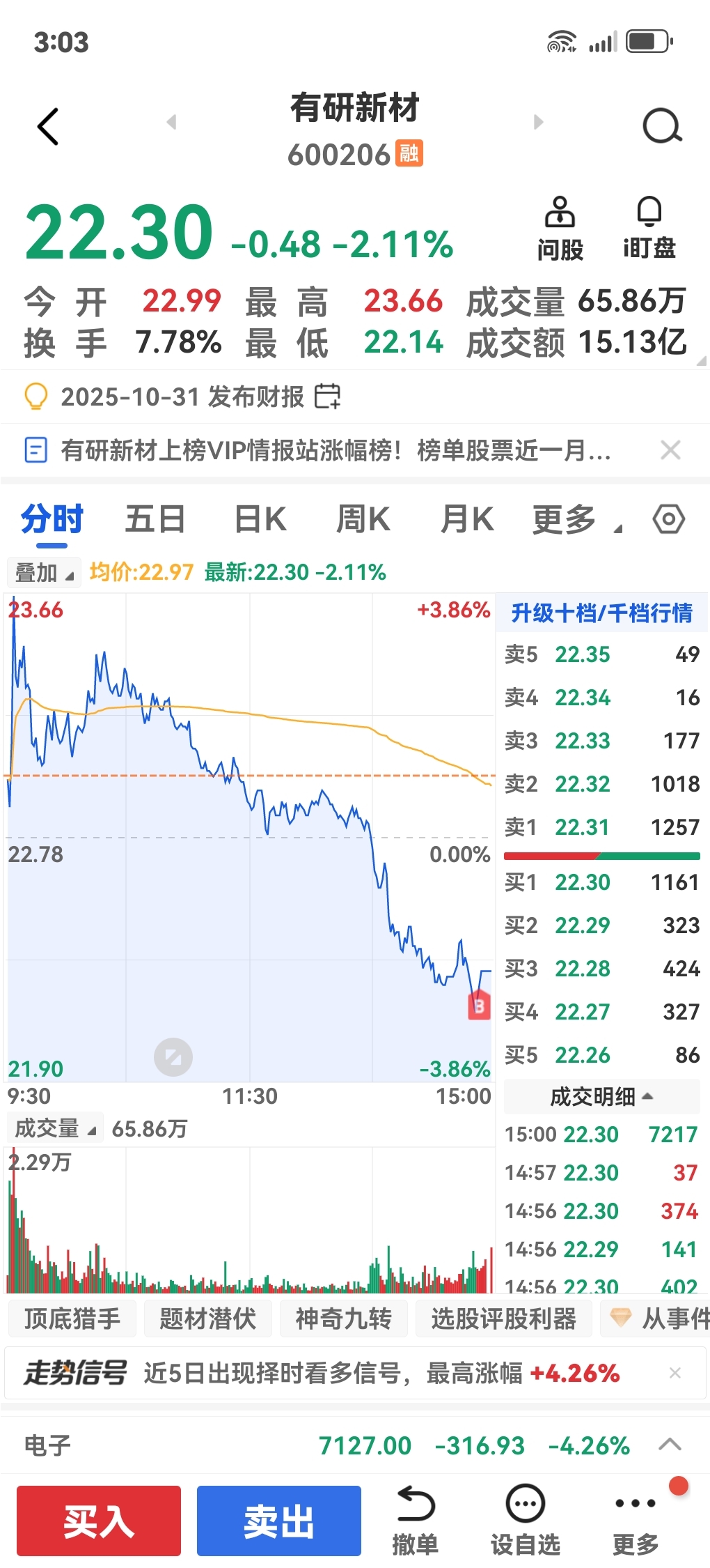 $有研新材(SH600206)$ 一阳鼎起四个阴,如果星期一再来一个阴,再加仓!