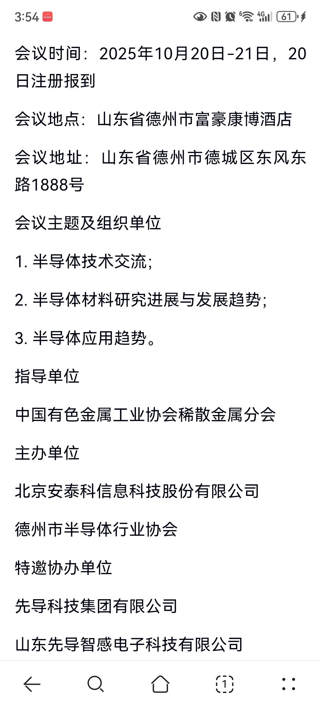 $有研新材(SH600206)$ 2025半导体材料产业发展(德州)大会。10月20日—10月21日在山东德州开会。有研新材的子公司山东有研艾斯半导体材料有限公司是德州当地企业,且有研新材在德州有重要的产业布局。