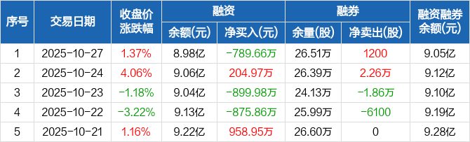 有研新材:融资净偿还789.66万元,融资余额8.98亿元(10-27)