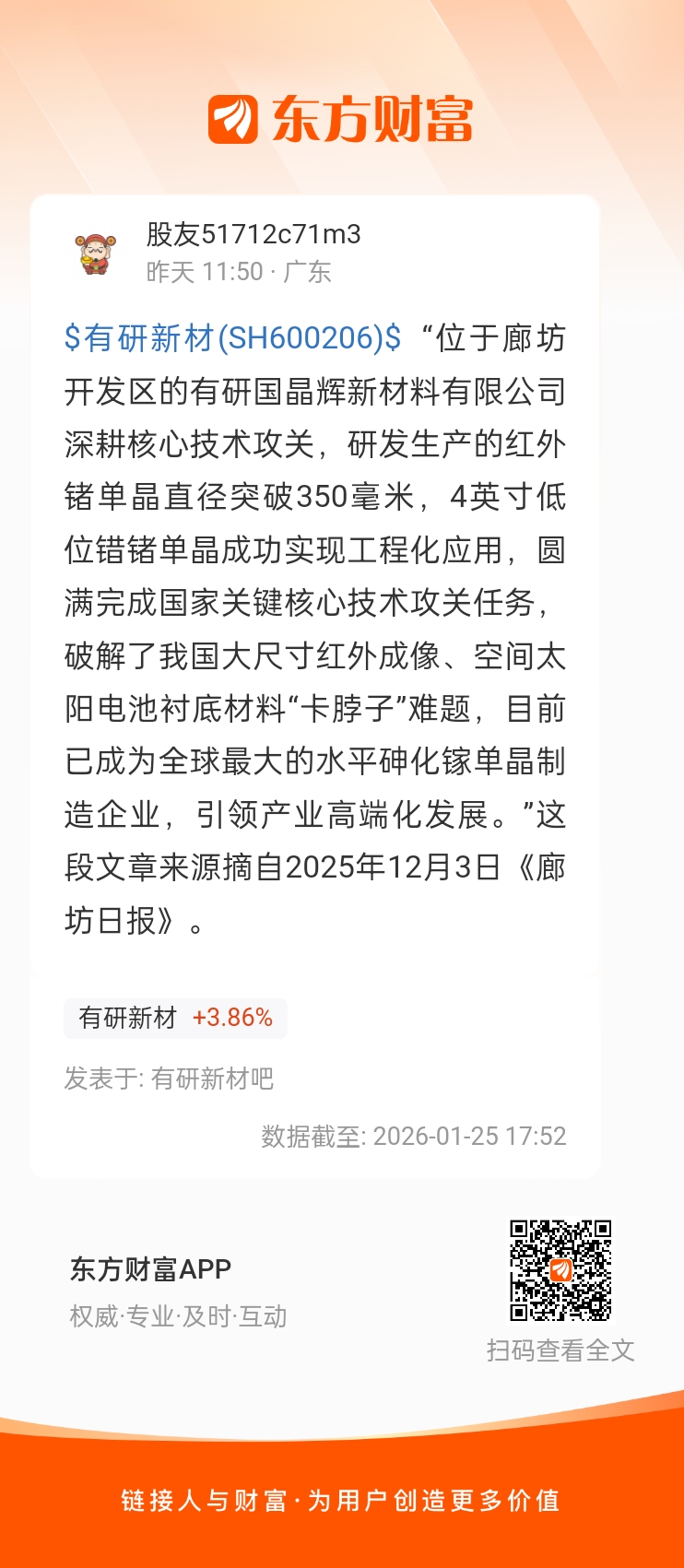 $有研新材(SH600206)$ “位于廊坊开发区的有研国晶辉新材料有限公司深耕核心技术攻关,研发生产的红外锗单晶直径突破350毫米,4英寸低位错锗单晶成功实现工程化应用,圆满完成国家关键核心技术攻关任务,破解了我国大尺寸红外成像、空间太阳电池衬底材料“卡脖子”难题,目前已成为全球最大的水平砷化镓单晶制造企业,引领产业高端化发展。”这段文章来源摘自2025年12月3日《廊坊日报》。