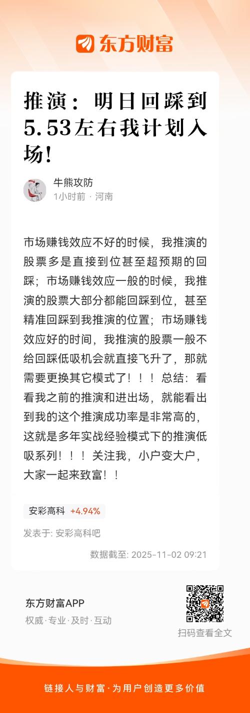 市场赚钱效应不好的时候,我推演的股票多是直接到位甚至超预期的回踩;市场赚钱效应一般的时候,我推演的股票大部分都能回踩到位,甚至精准回踩到我推演的位置;市场赚钱效应好的时间,我推演的股票一般不给回踩低吸机会就直接飞升了,那就需要更换其它模式了!!!总结:看看我之前的推演和进出场,就能看出到我的这个推演成功率是非常高的,这就是多年实战经验模式下的推演低吸系列!!!关注我,小户变大户,大家一起来致富!!