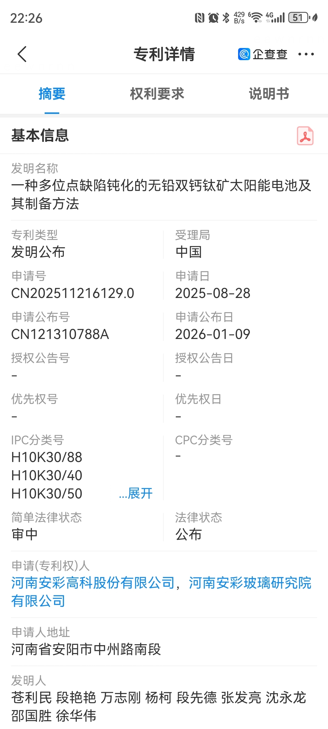 $安彩高科(SH600207)$ 一种多位点缺陷钝化的无铅双钙钛矿太阳能电池及其制备方法,钙钛矿电池??