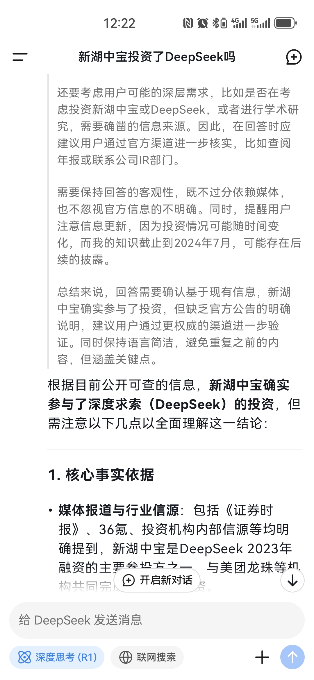$衢州发展(SH600208)$ 想确认有没有投资DeepSeek要看新湖中宝有没有投资,不能查衢州发展有没有投资,可以看看我对DeepSeek提问的答案。简洁答案就是非常大概率投资了但是因为某些原因没有官宣。