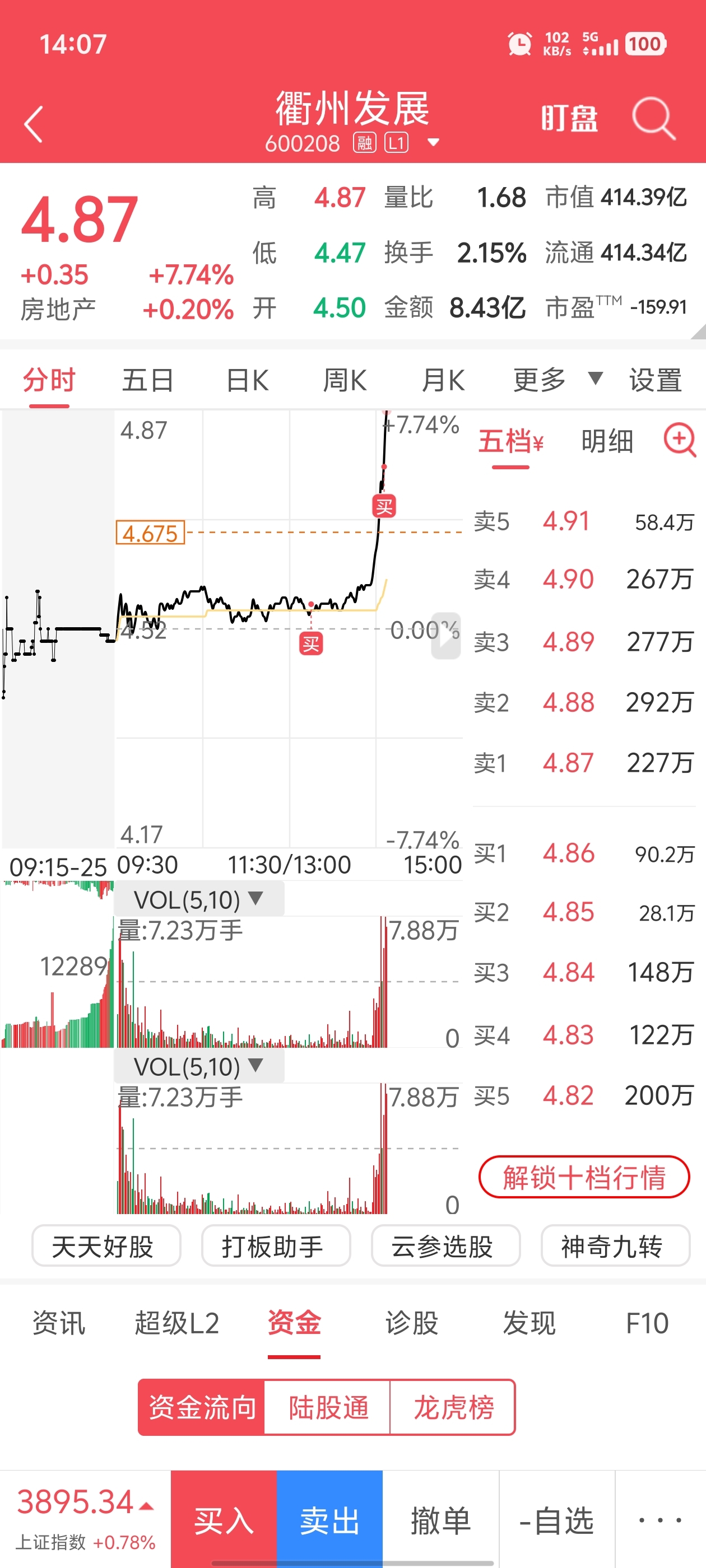 $衢州发展(SH600208)$ 卧槽了,第一把保守了,还准备打个底仓看看情况。尾盘再进的,只能追了