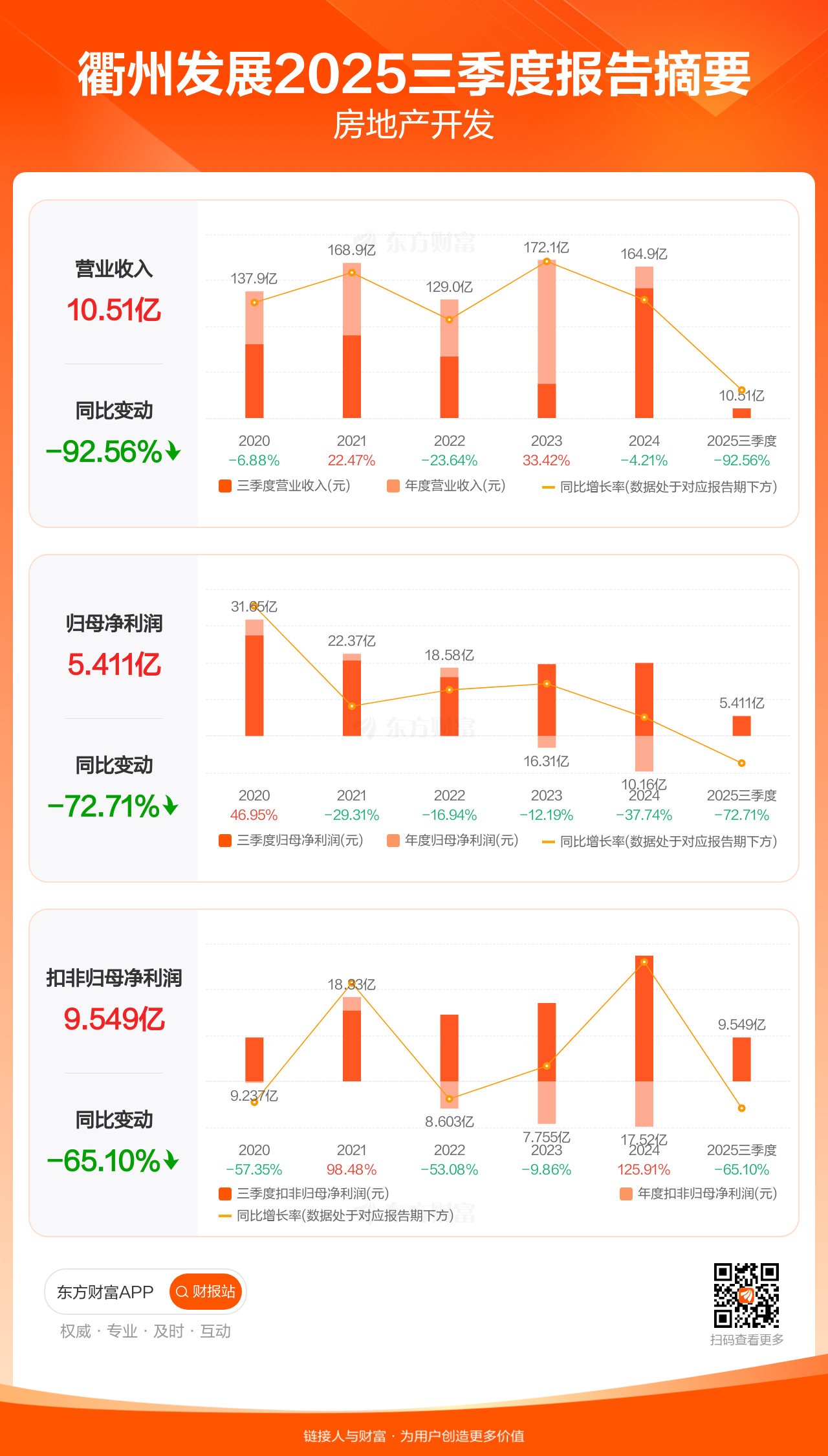 衢州发展10月31日发布2025年三季报显示,公司前三季实现营业收入10.51亿元,同比下滑92.56%;归母净利润5.41亿元,同比下滑72.71%;扣非归母净利润9.55亿元,同比下滑65.10%。