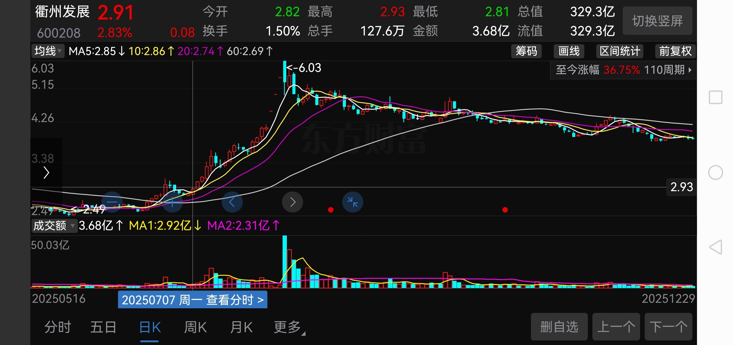 $衢州发展(SH600208)$ 前七年最高收盘3.70,最低开盘2.16。3.7+2.16=5.86/2=2.93。转折2.93。