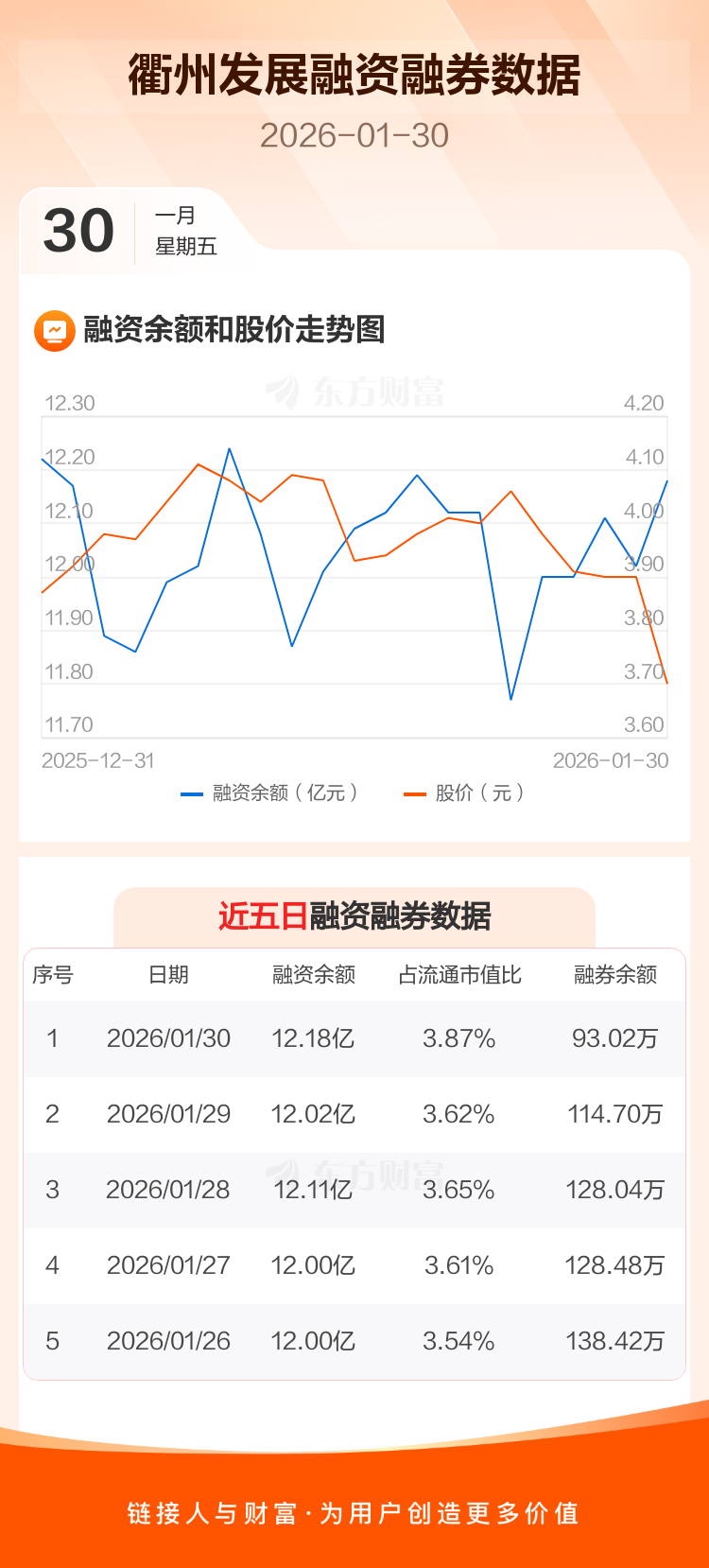 交易所最新数据显示,衢州发展于2026年1月30日获融资买入5902.27万元,融资偿还4275.30万元,当日融资净买入1626.96万元。目前,该股融资余额12.18亿,占流通市值比例为3.87%。