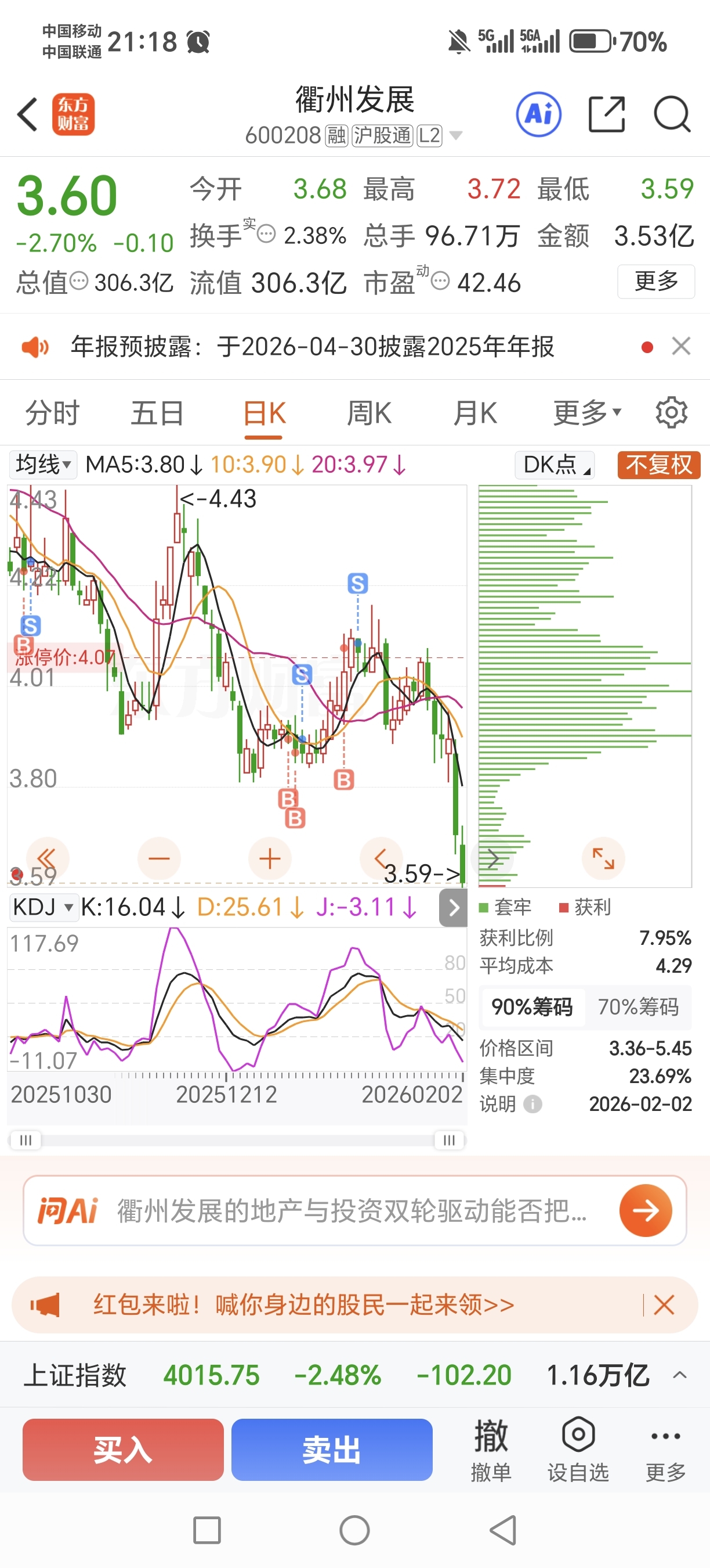 衢州发展这个筹码峰看得头皮发麻,4块横盘几个月了终究还是掉下来了,4.29的平均