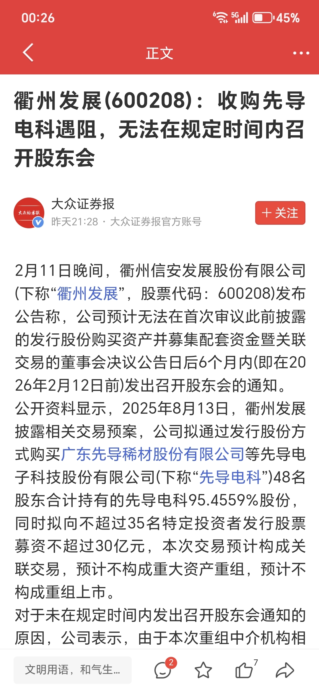 $衢州发展(SH600208)$ 收购遇阻,明天大跌5个点了