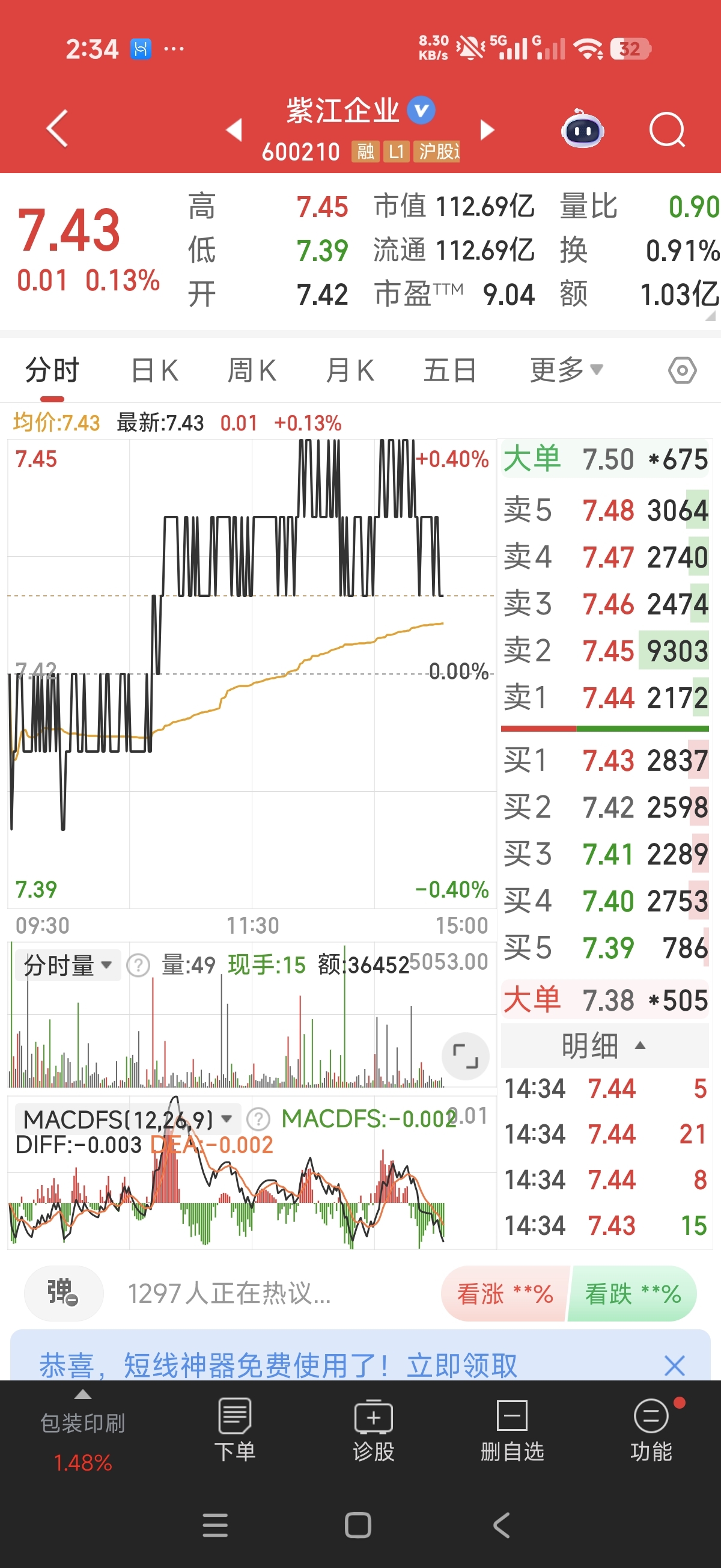 $紫江企业(SH600210)$ 还有半小时,大胆预测,收盘涨一分钱