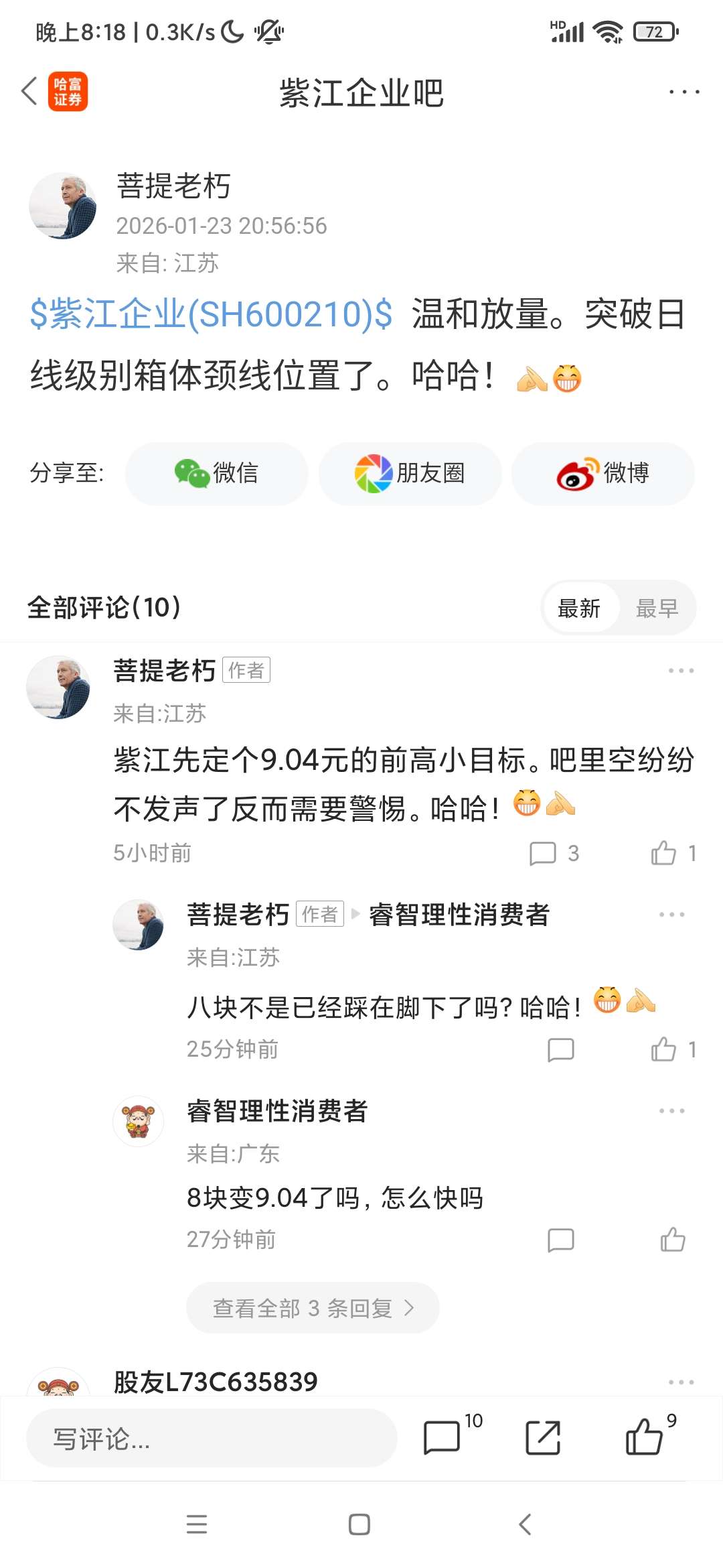 温馨提示: 1.根据《证券法》规定,禁止编造、传播虚假信息或者误导性信息,扰乱证券市场;2.用户在本社区发表的所有资料、言论等仅代表个人观点,与本网站立场无关,不对您构成任何投资建议。用户应基于自己的独立判断,自行决定证券投资并承担相应风险。《东方财富社区管理规定》