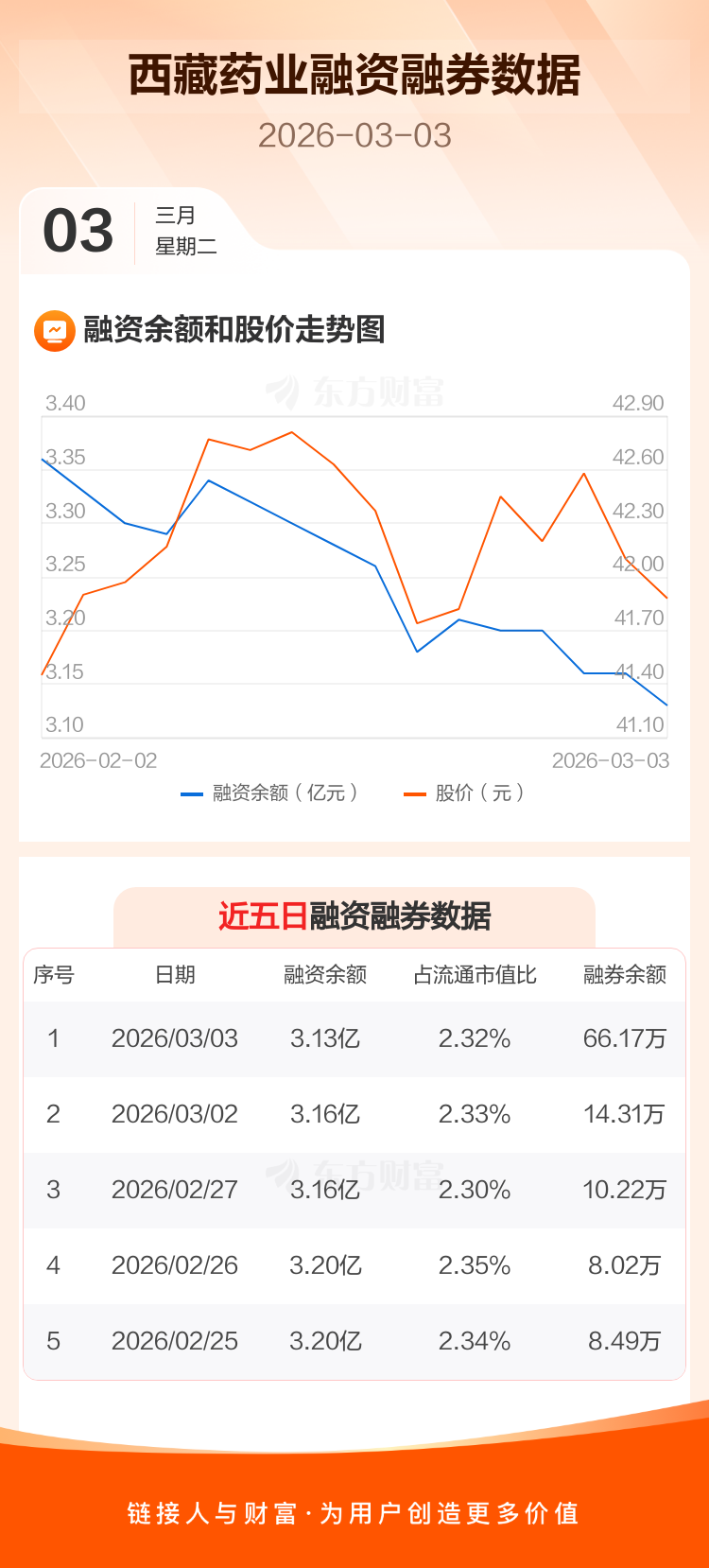 交易所最新数据显示,西藏药业于2026年3月3日获融资买入1320.17万元,融资偿还1662.86万元,当日融资净偿还342.69万元。目前,该股融资余额3.13亿,占流通市值比例为2.32%。