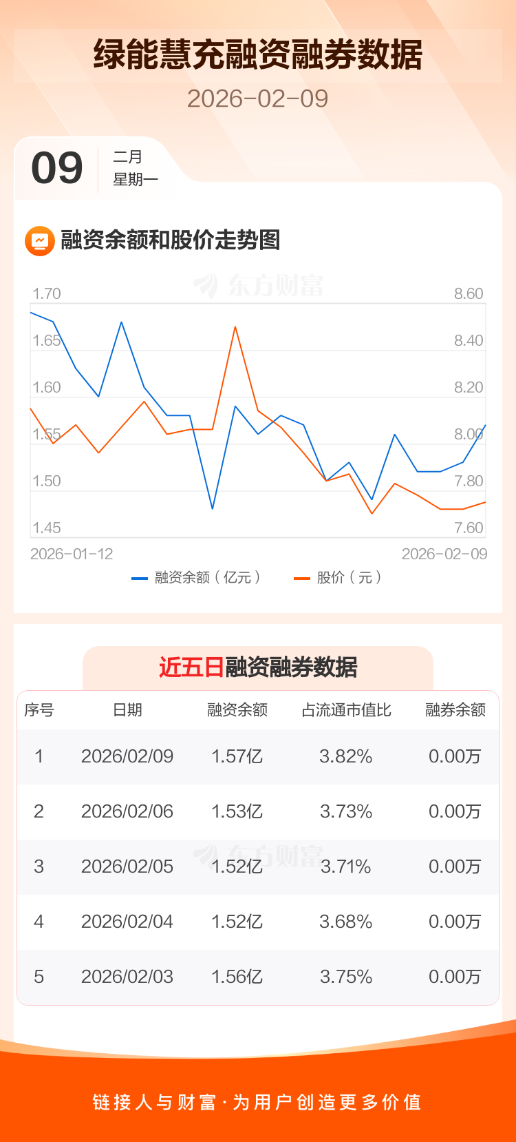 交易所最新数据显示,绿能慧充于2026年2月9日获融资买入983.17万元,融资偿还541.31万元,当日融资净买入441.85万元。目前,该股融资余额1.57亿,占流通市值比例为3.82%。