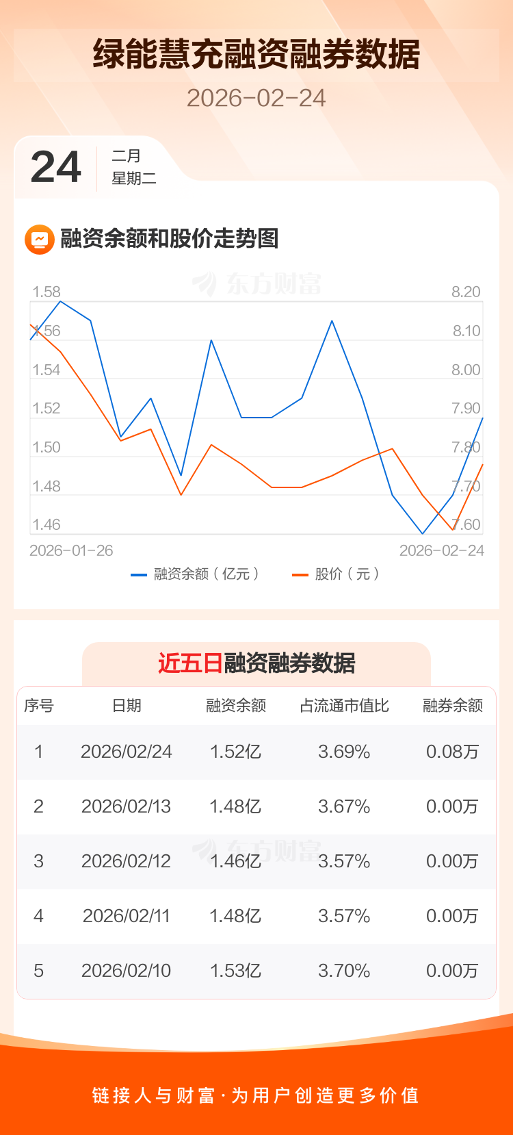 交易所最新数据显示,绿能慧充于2026年2月24日获融资买入1230.54万元,融资偿还826.28万元,当日融资净买入404.26万元。目前,该股融资余额1.52亿,占流通市值比例为3.69%。