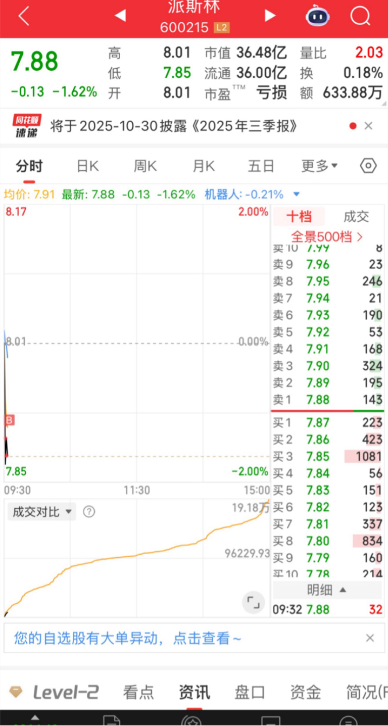 $派斯林(SH600215)$ 早上上主力的当了,但是感觉776是铁底,没有子弹了,还有小几万别的股,不可能满仓的,继续跌就拿几万块做T,跟主力长期肉搏
