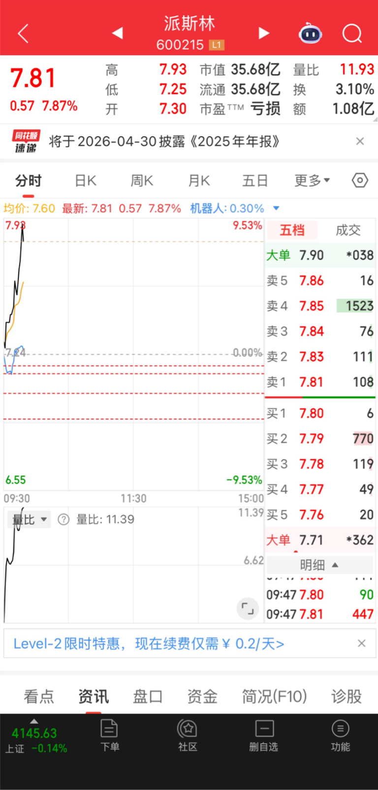 $派斯林(SH600215)$ 就差我这百来手就涨停了?