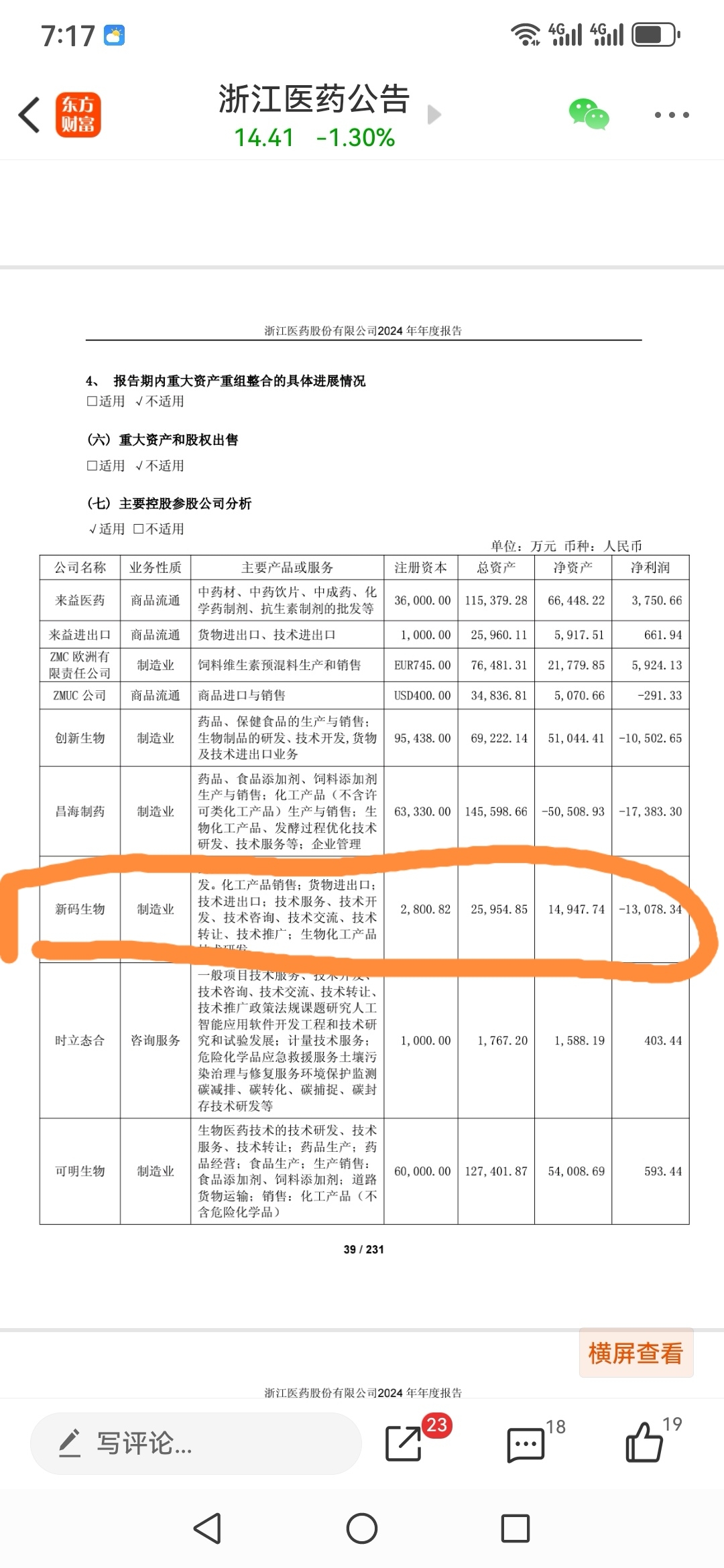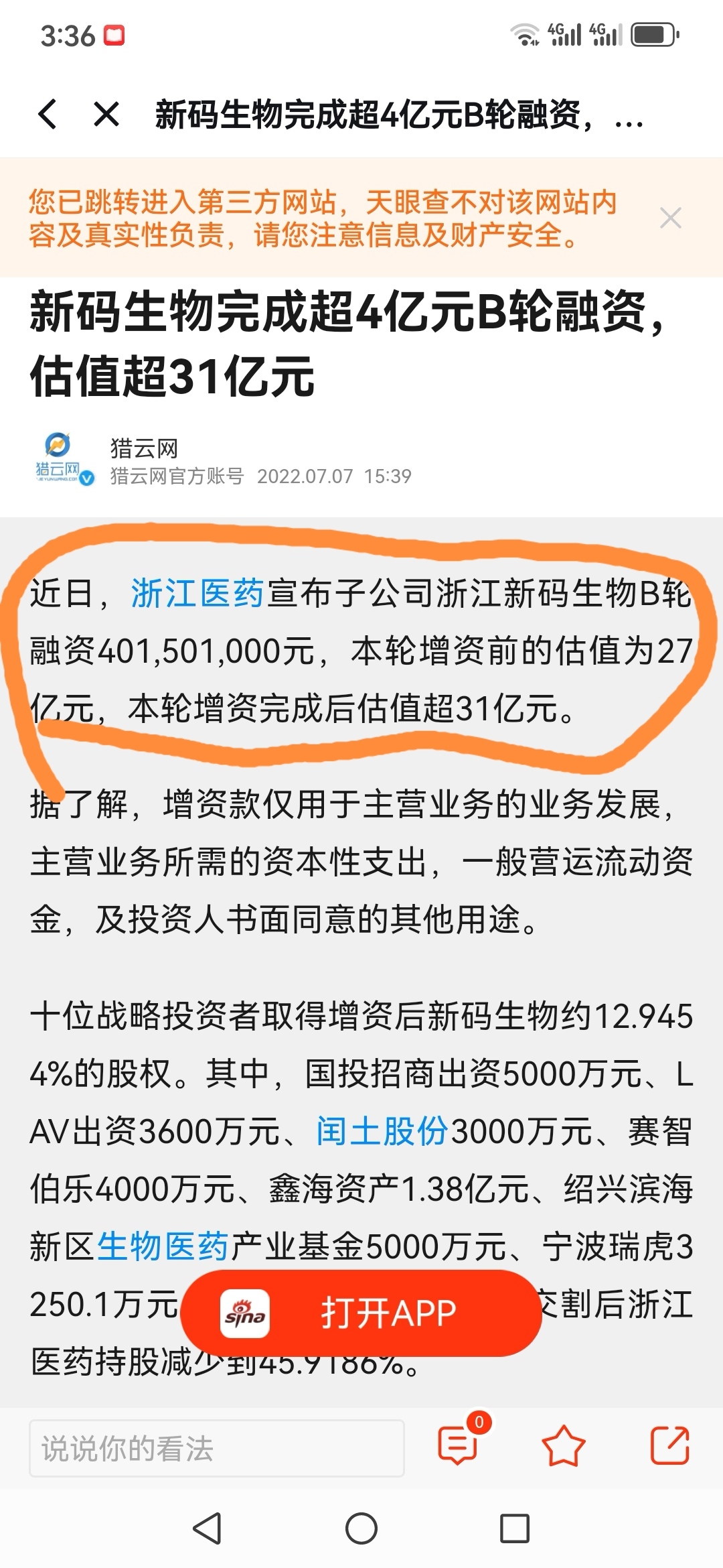 $浙江医药(SH600216)$ 控股子公司新码生物,2022年在788项目第三期验证结果出来之前估值已达31亿,2023年3月份第三期验证提前结束向药监部门申请批文,当前正与药明康德协商商业化代工生产,猜想批文也即将下发。新码生物当前最新估值应在50亿以上了,如果批文下来生产启动,估值至少百亿规模。而浙医目前只按1.4亿左右的账面价值合并报表。可以说788就是浙医所期待的最重磅产品。