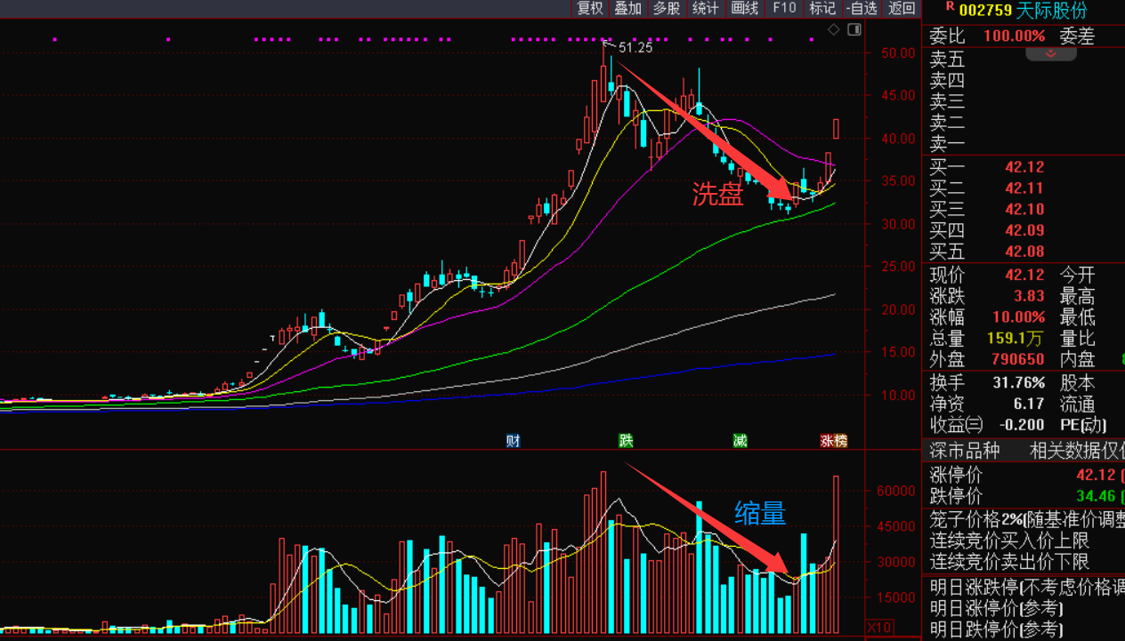 这票今天也创出新高走二波行情,前面老A说它和航天动力双龙头应该会有第二波行情,今天大阳线,但成交量也是萎缩的,预计这周应该是不错的出局时机了。