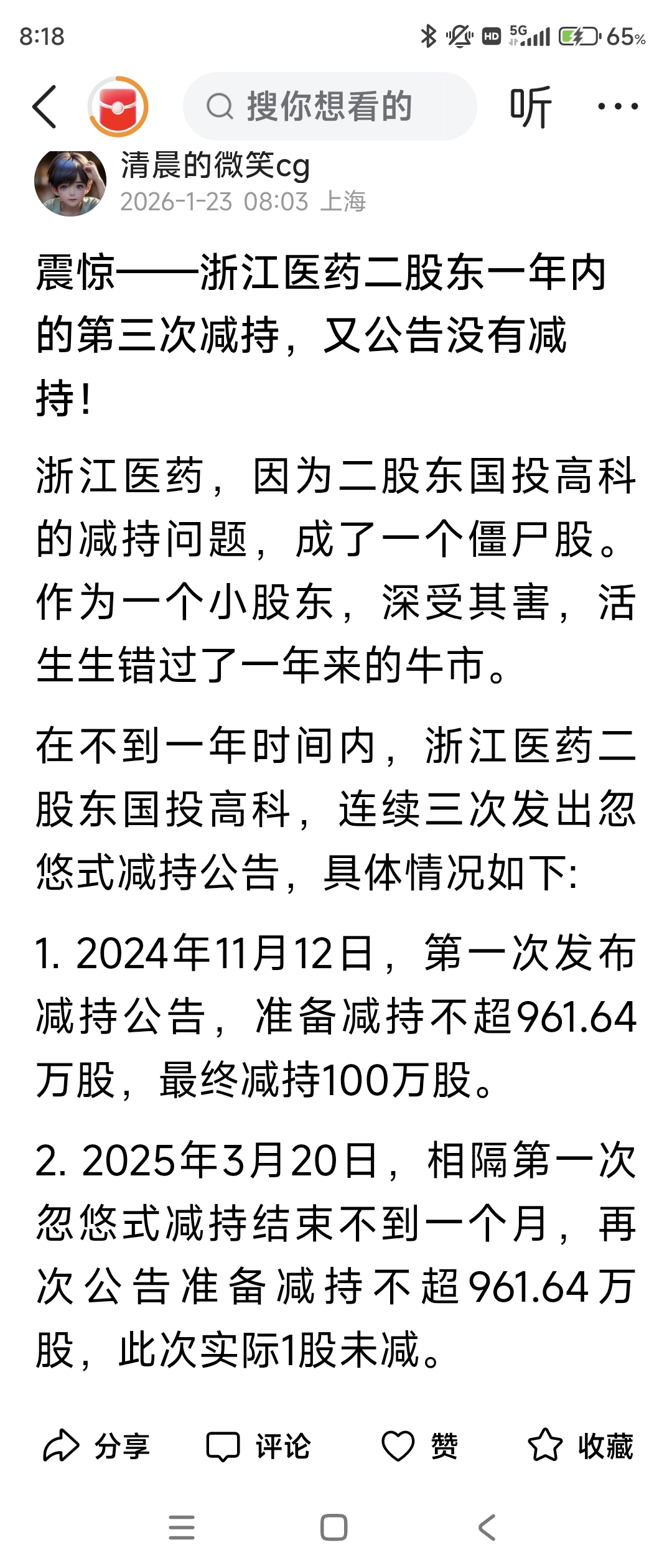 $浙江医药(SH600216)$ 在《头条》等平台上上发表文章,控诉浙江医药二股东国投高科的忽悠式减持恶行,期待证监会能够关注到忽悠式减持问题,进而堵塞减持漏洞。