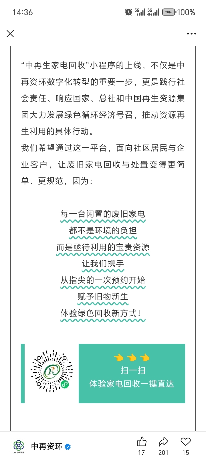 $中再资环(SH600217)$ “中再生家电回收”小程序重磅上线!一键回收,码上行动!
