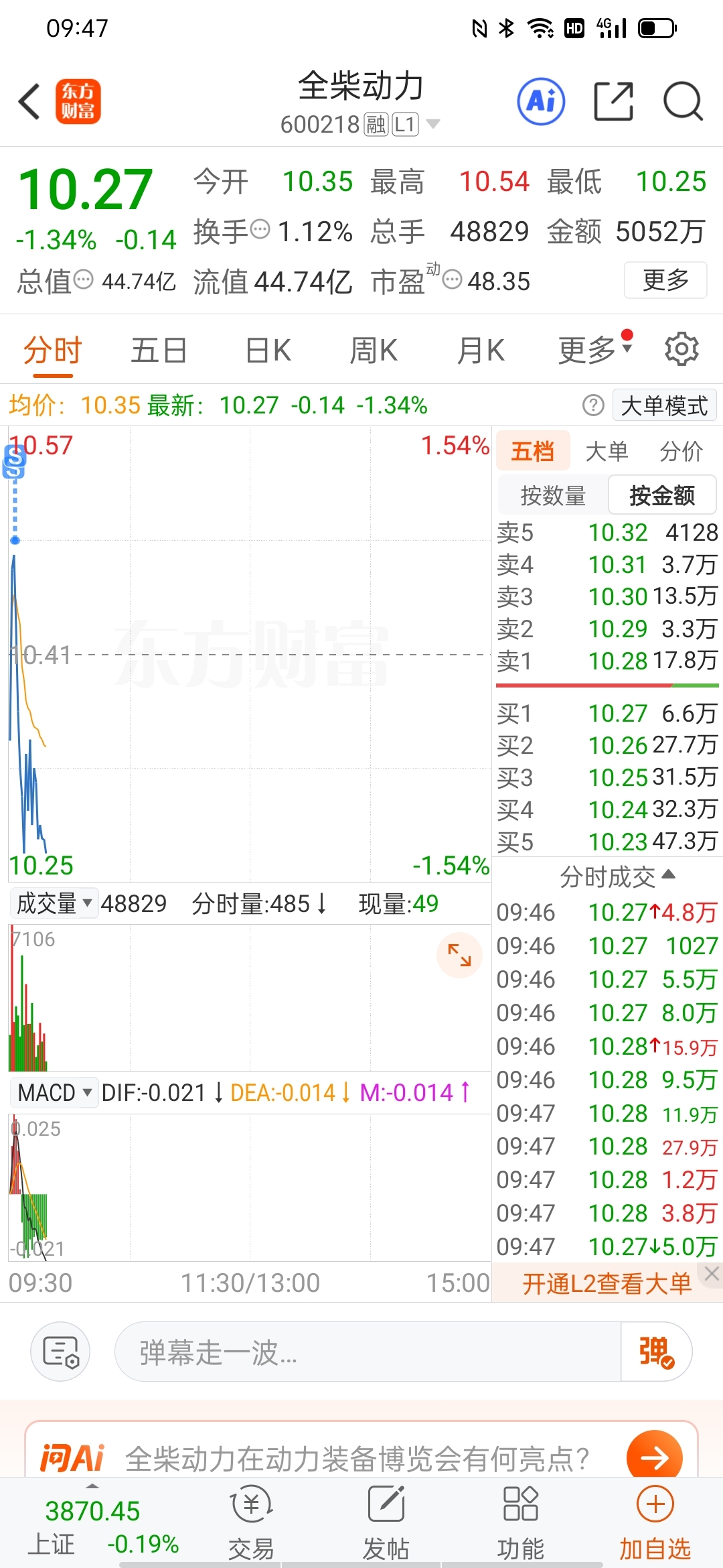 $全柴动力(SH600218)$ 破位下跌,还好跑得快,没对这货再抱有幻想
