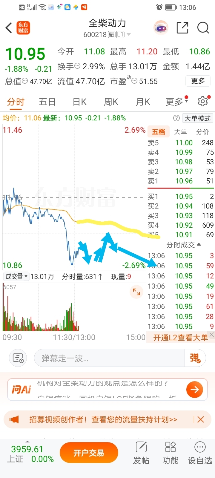 $全柴动力(SH600218)$ 盘中无量反抽,黄色均价线压制,下午还会有一波快速反抽。