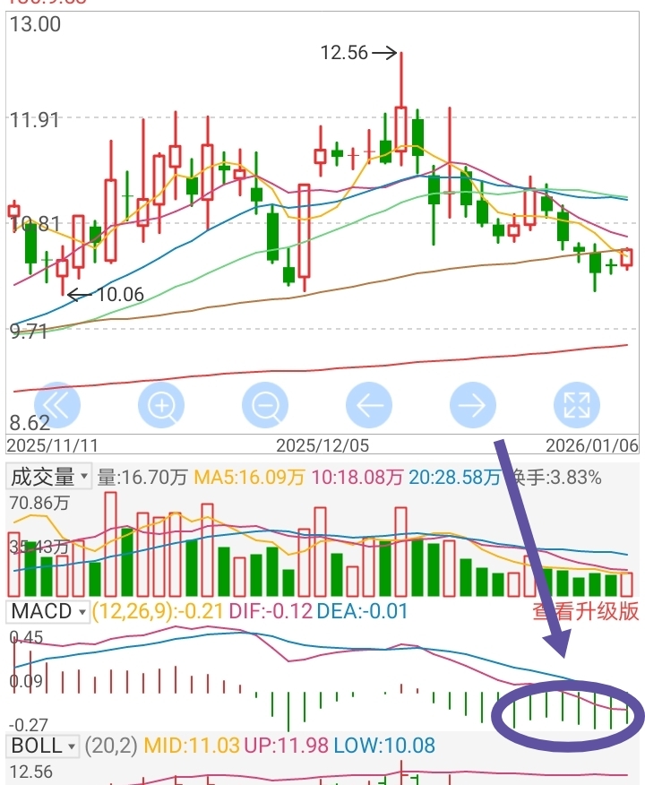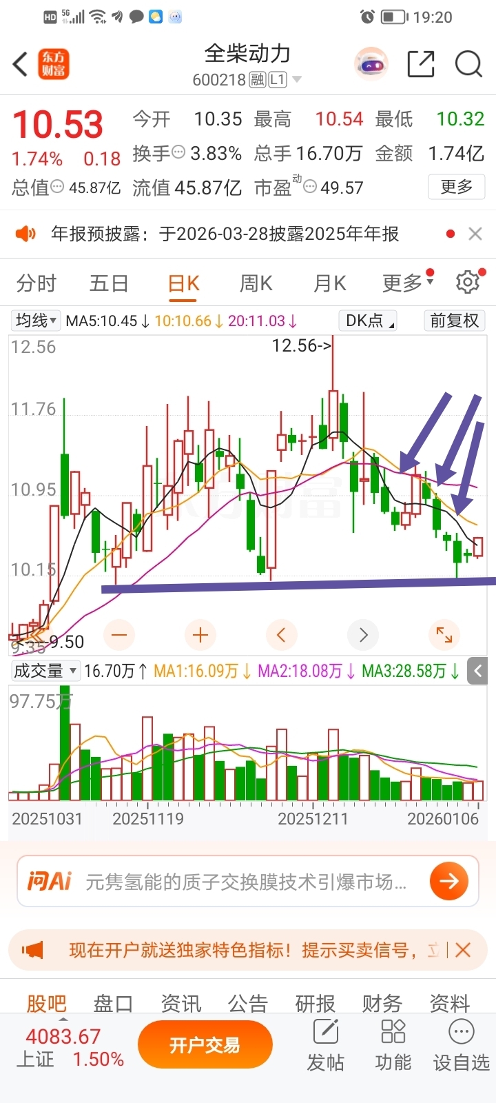 $全柴动力(SH600218)$ 一哥观点:应广大粉丝的呼吁,一哥还是简单分析一下吧, 今日走势依然鸡肋,尾盘两点半后开始上翘,量能依然没有放大,放量起码是二倍才能说明有主力参与。箭头所指黄色的十日均线,全柴始终是受十日均线压制,明天应该有一个翻红的动作触摸一下十日均价线再打压下来。唯一好一点的征兆是macd绿色柱体今日第一天缩短。