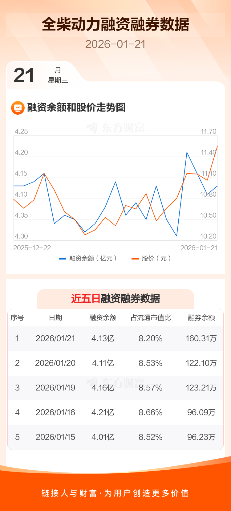 交易所最新数据显示,全柴动力于2026年1月21日获融资买入4377.52万元,融资偿还4206.70万元,当日融资净买入170.82万元。目前,该股融资余额4.13亿,占流通市值比例为8.20%。