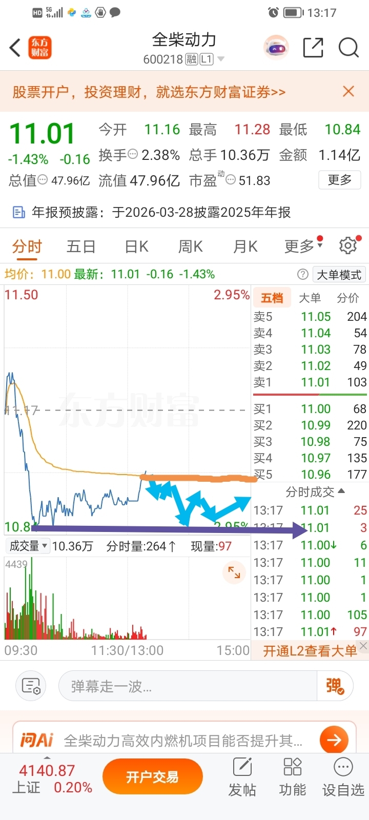 $全柴动力(SH600218)$ 盘中走势已经画出!!