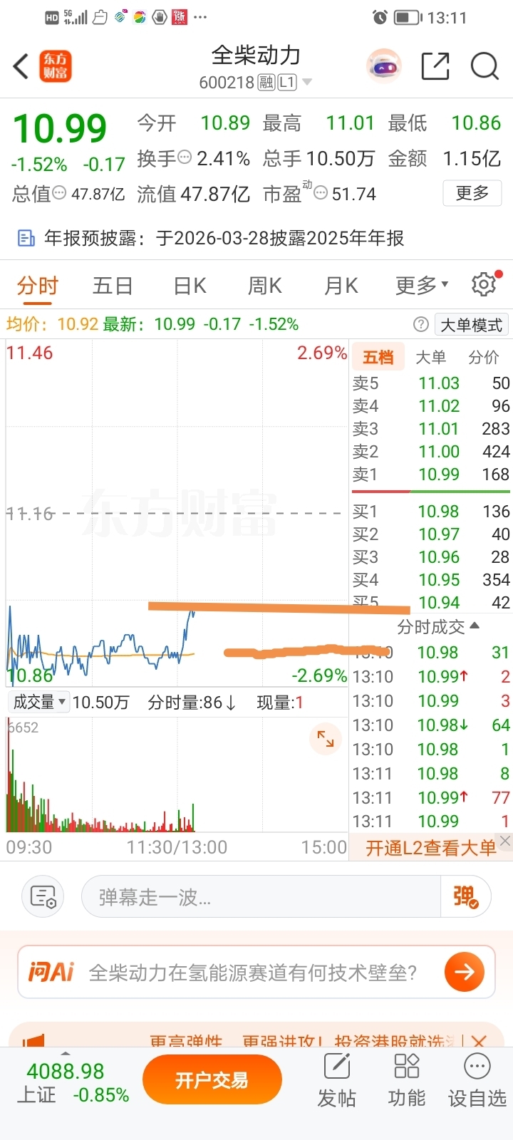 $全柴动力(SH600218)$ 没戏,均价线纹丝不动,这不扯呢吗?一会就踩下去。
