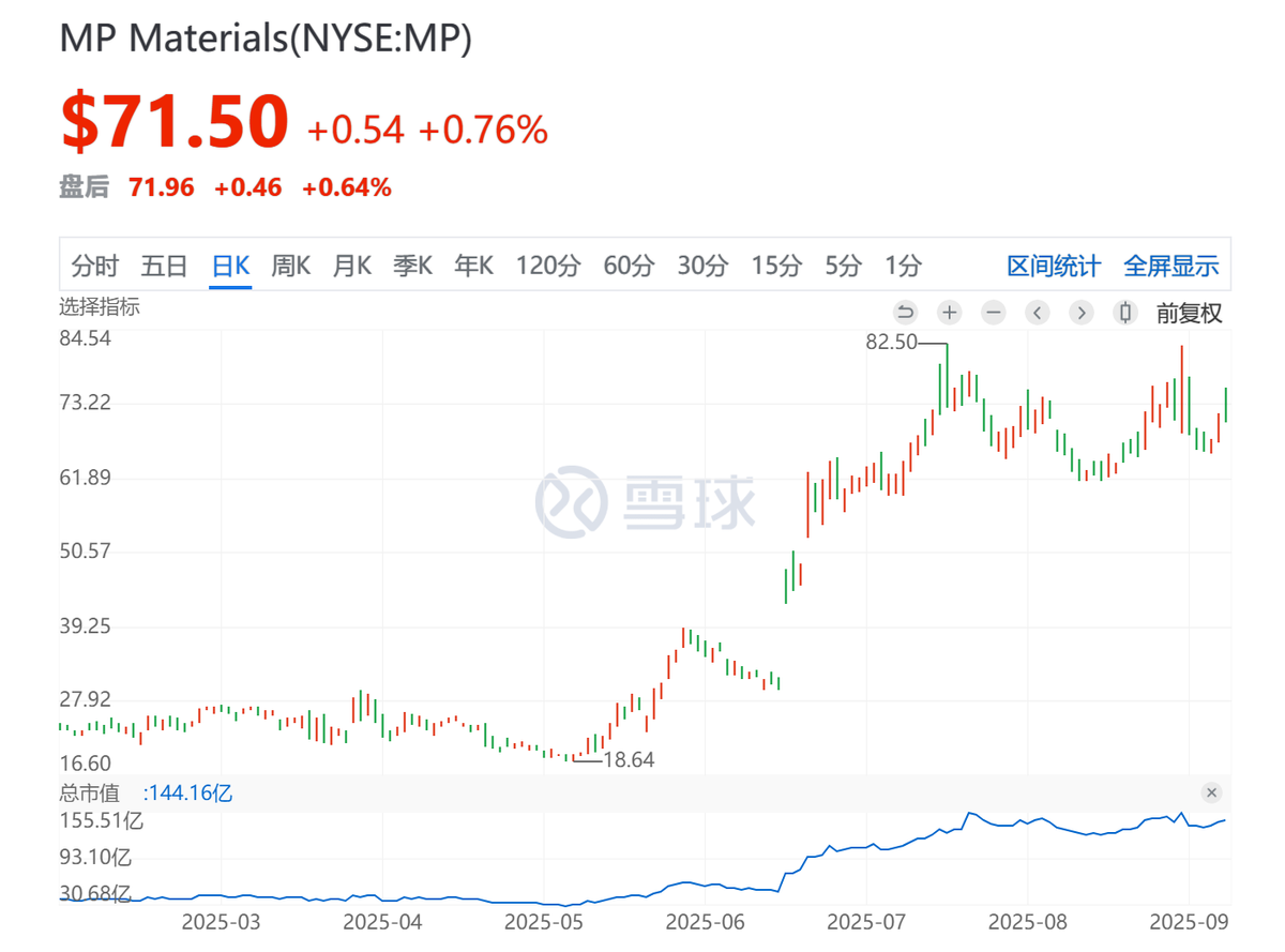 一个极具参考价值的例子是美国的稀土公司MP Materials。随着稀土逐渐成为科技博弈的关键战略资源,MP Materials因其作为美国本土稀土开发“救命稻草”的独特定位,市值大幅上涨,并反过来引发了市场对中国稀土龙头公司估值的全面提升。