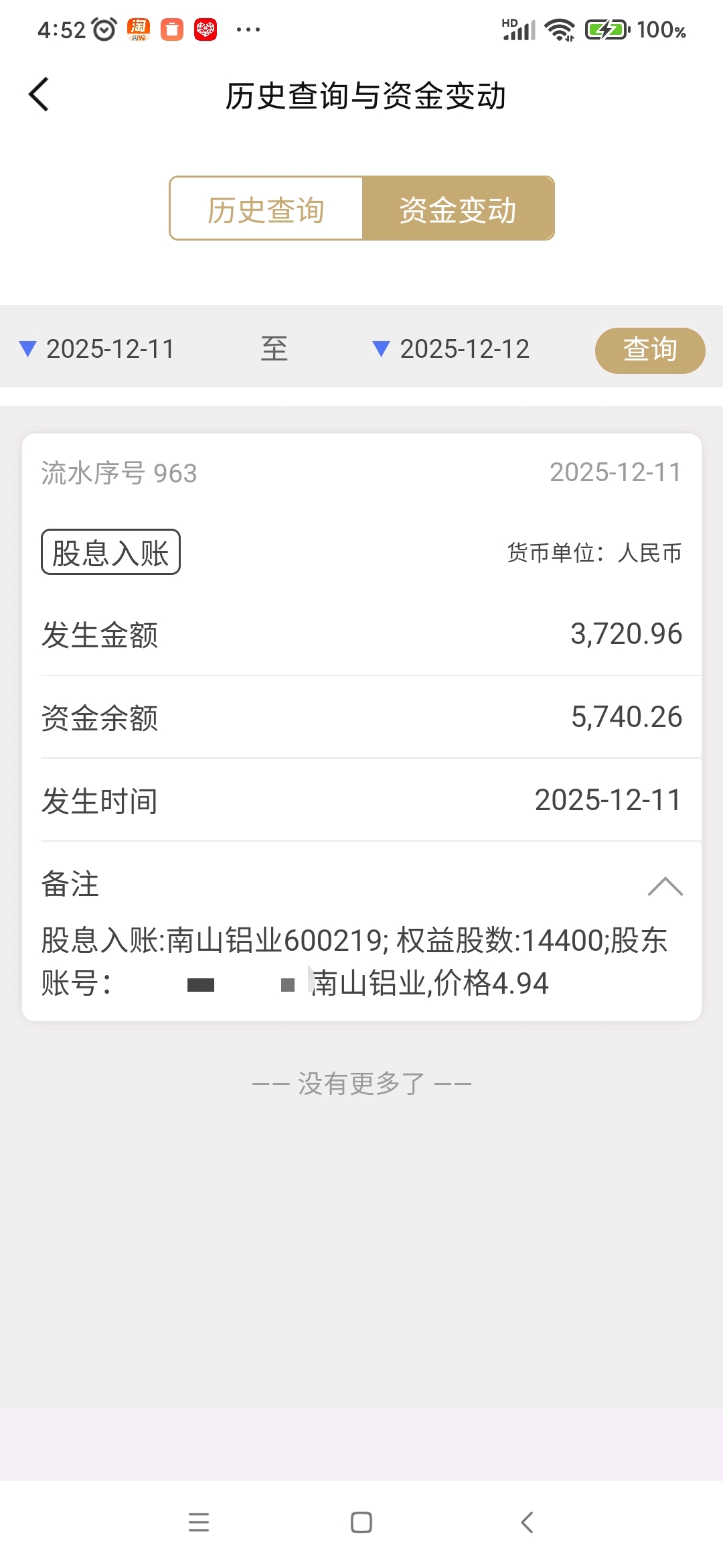 $南山铝业(SH600219)$ 来吧,一起晒晒股息入账截图。我先来