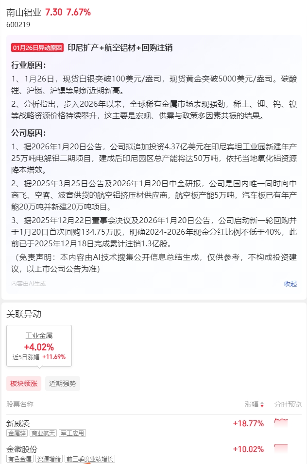 南山铝业异动主因印尼电解铝落地、高分红回购、高端铝材壁垒,业绩稳健估值合理,技术多头强势,资金情绪回暖。龙头稀缺性凸显,但需盯住海外进度和铝价,后劲可期,蹲住信