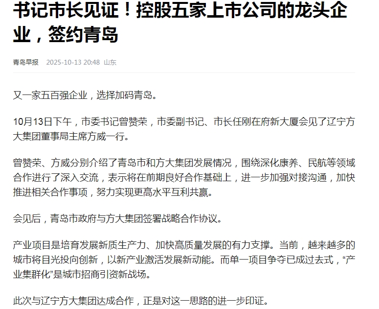 青岛市政府与方大集团签署战略合作协议,围绕深化康养、民航等领域合作进行了深入交流