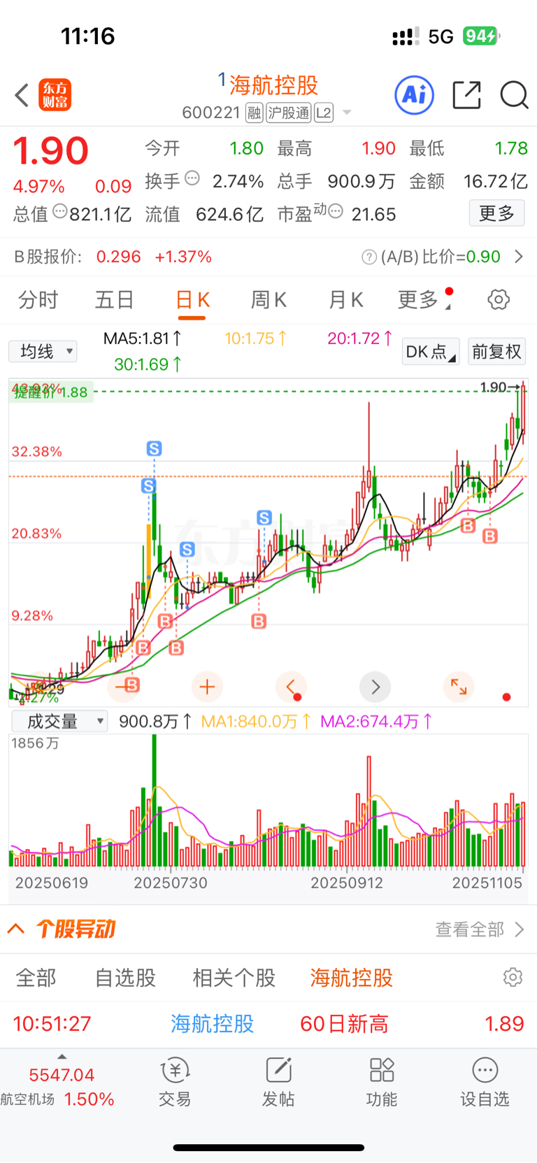 $海航控股(SH600221)$ 这么好的走势根本不敢t就怕t飞