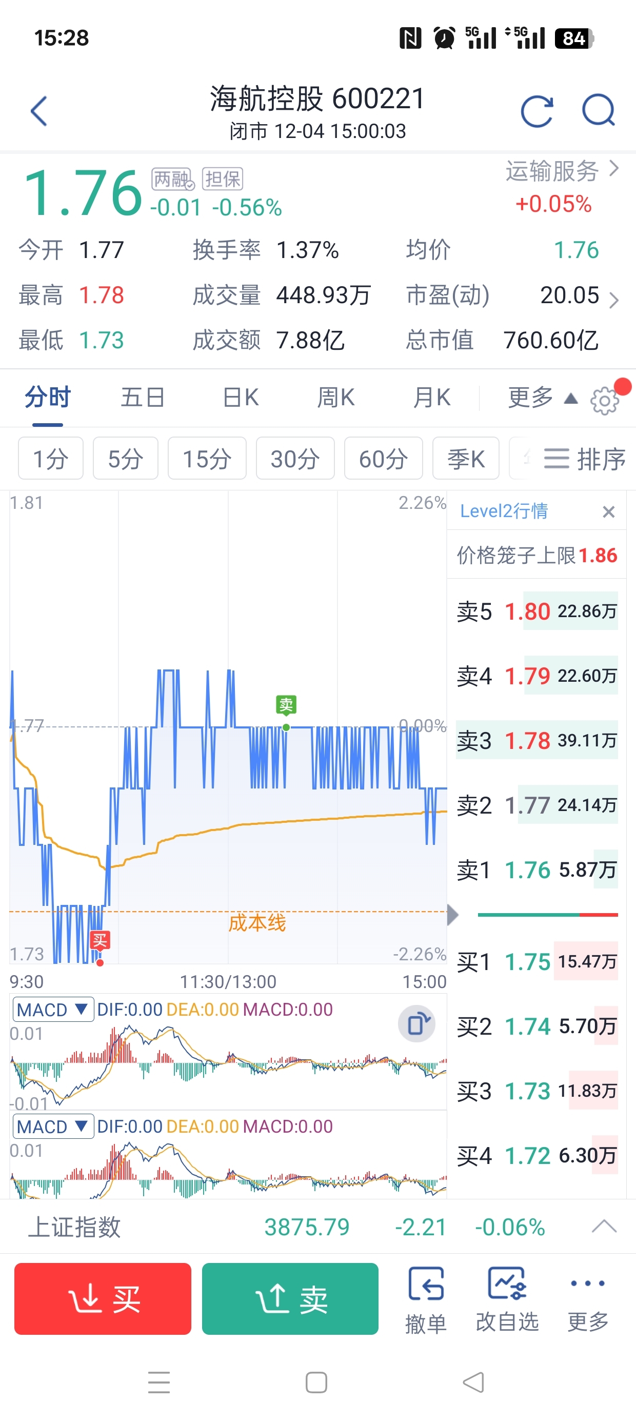 1.73 买了19000股,等了半天站不稳1.78,赶紧1.77卖了。