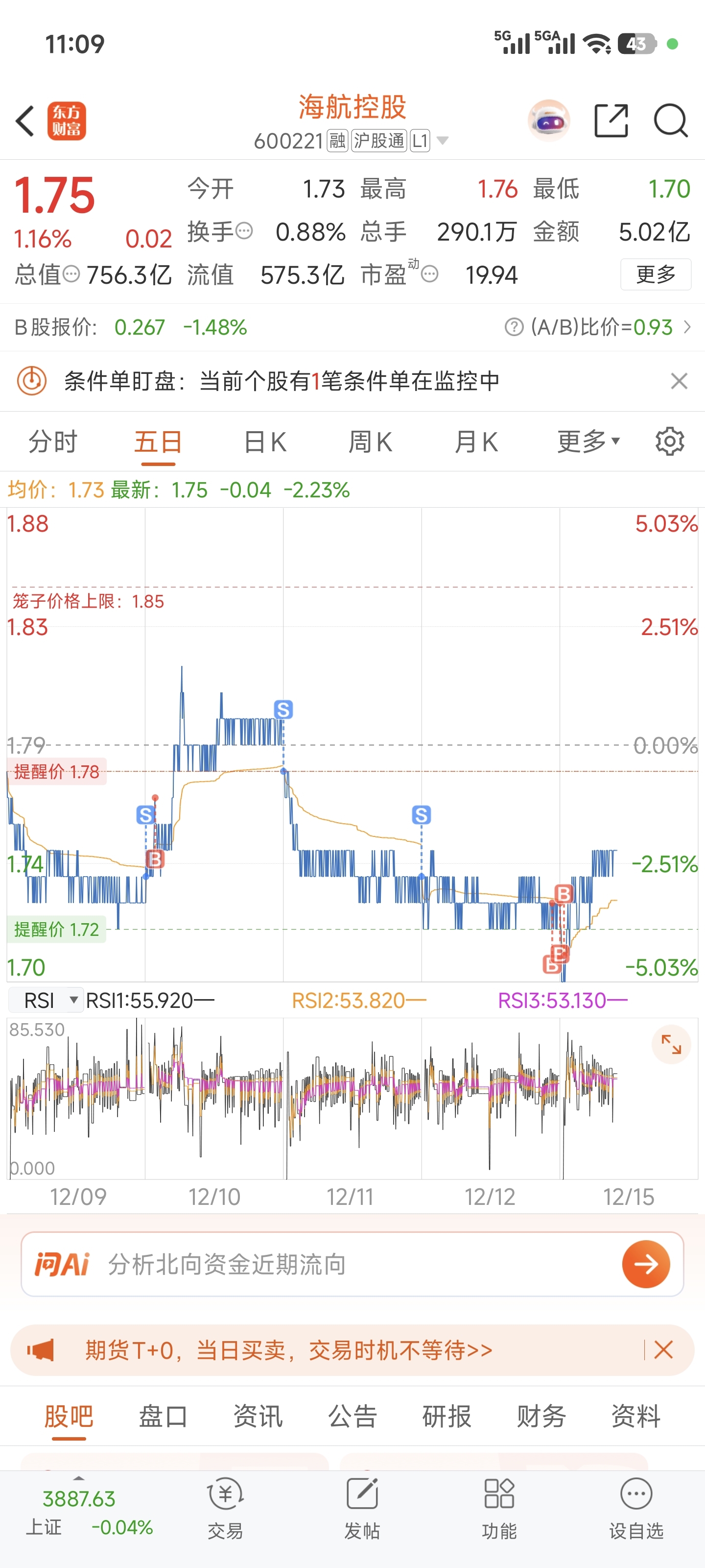 $海航控股(SH600221)$ 争取拉个涨停跑路,从1.91进来套到现在了,做T加仓干到1.78的本了