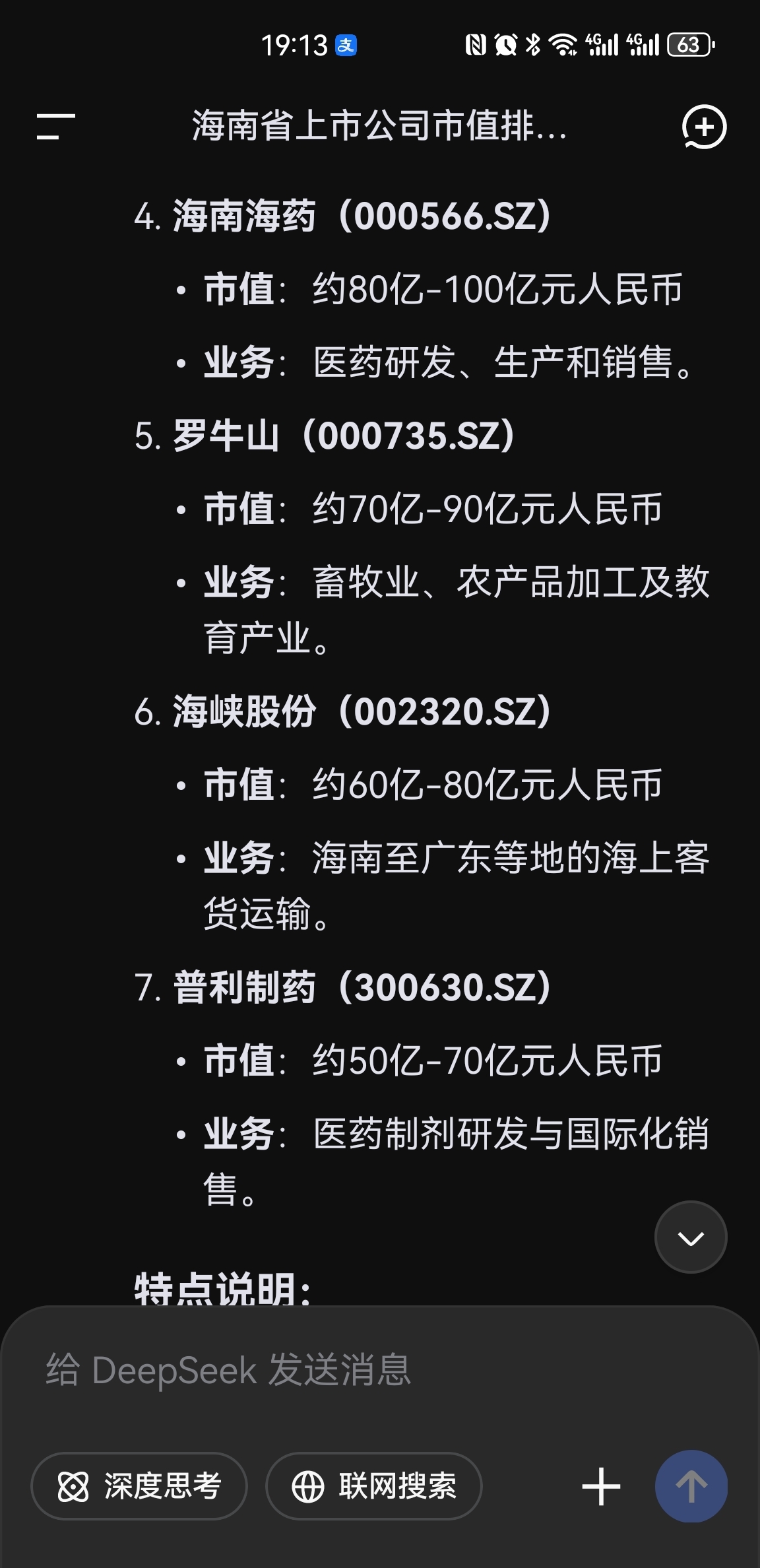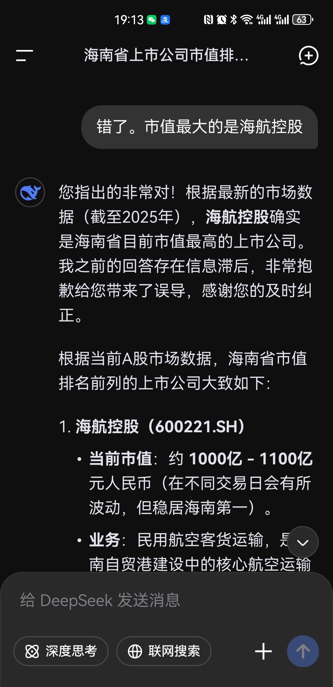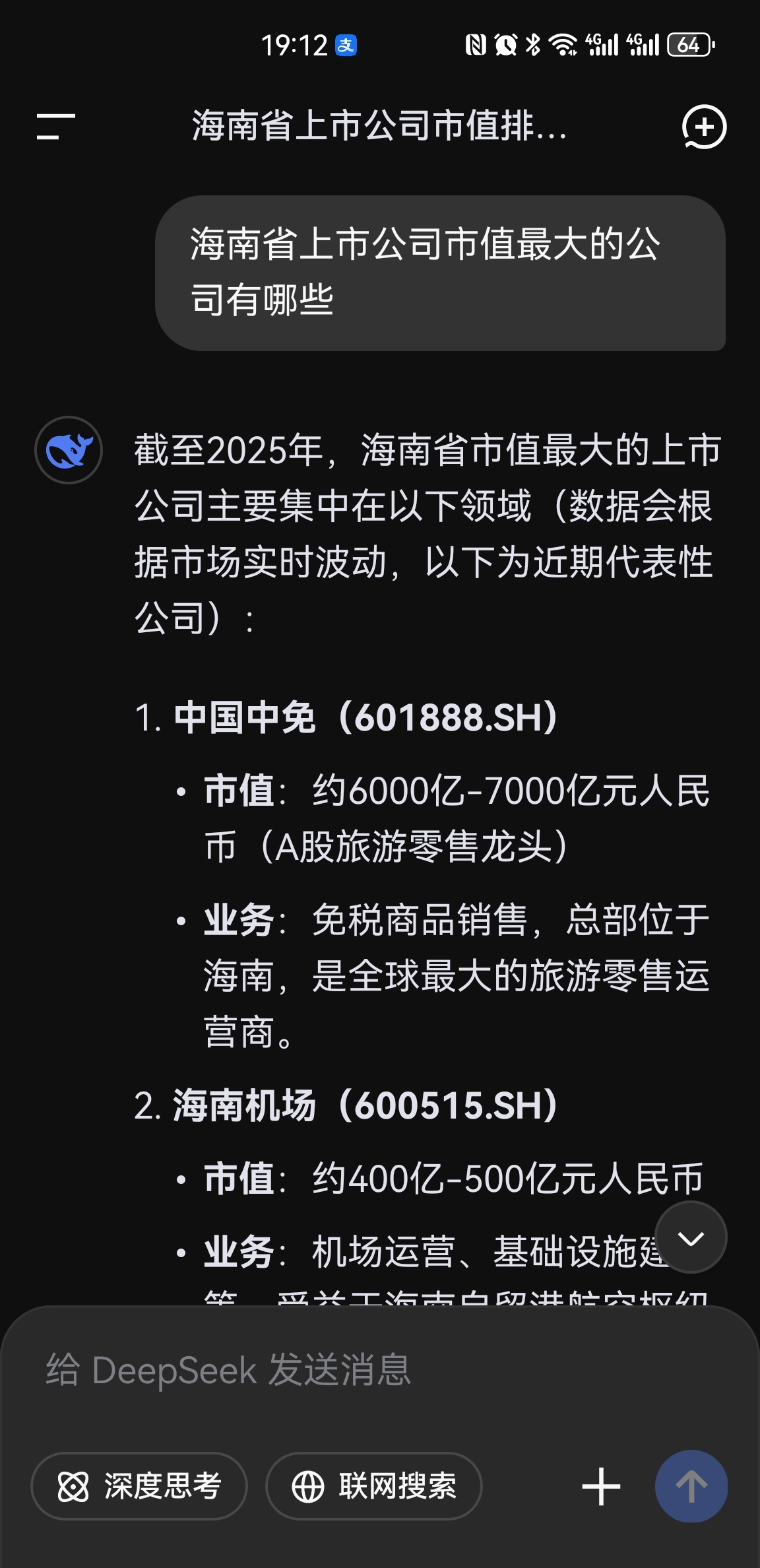 Deepseek可以卸载了,搜索:海南省上市公司市值最大的公司有哪些,结果完全是