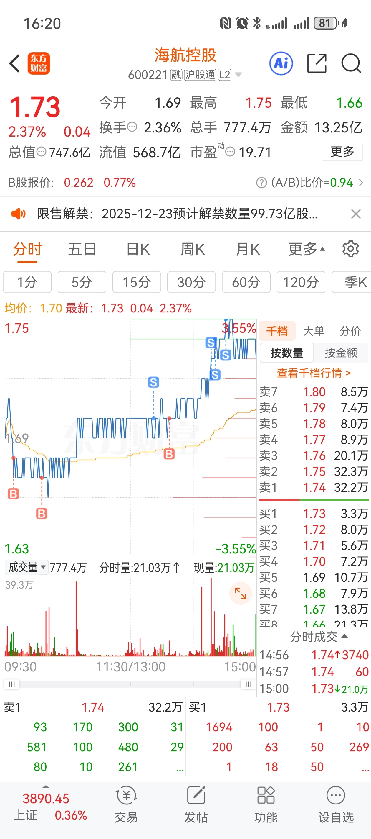 $海航控股(SH600221)$ 什么情况这是,下午有事没看盘,今天挂的单全给我吃了,1.75的单也没放过啊