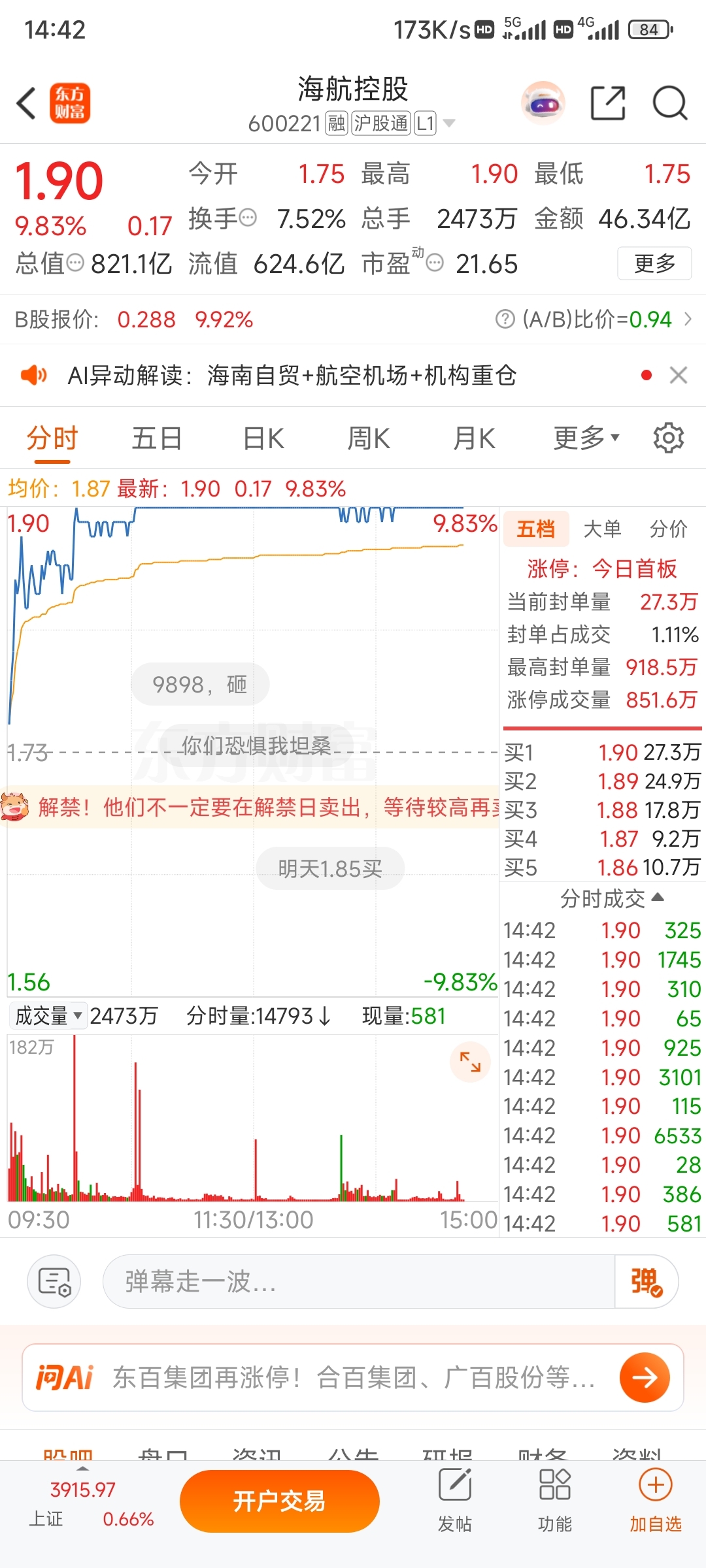 $海航控股(SH600221)$ 第一次见封板了还成交这么大的股