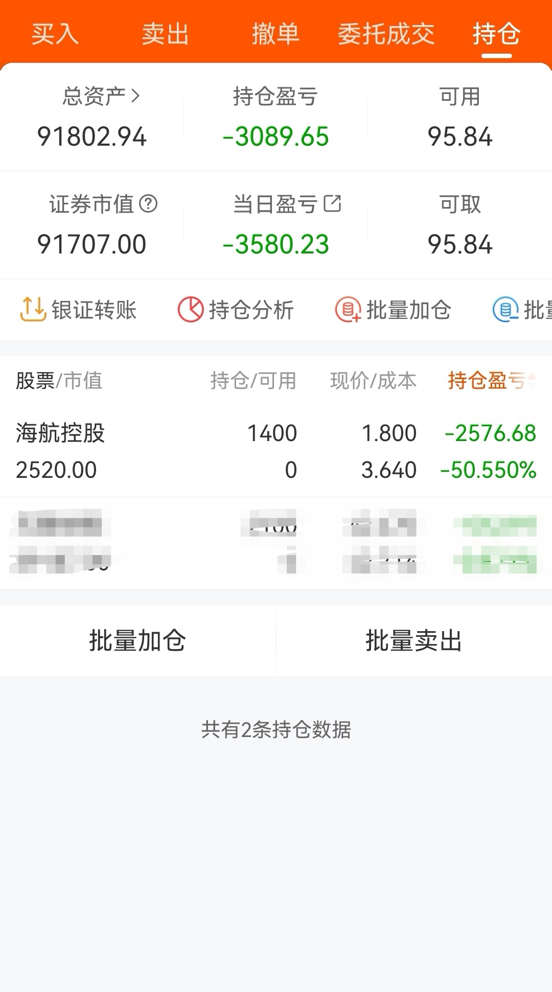 $*ST云网(SZ002306)$ $天赐材料(SZ002709)$ $*ST万方(SZ000638)$ 今日亏损3580,水果不卖了,一晚上可能还卖不到100块钱,可见赚钱有多难啊,股市上一天几千几万的亏,想想没啥意思,剩下的自己吃了。早盘海航1.9犹豫了一下没卖掉,1.84割了,看来不能预期太高,有点利润跑就对了!每天发帖激励自己,9万起步,向第一目标50万进发