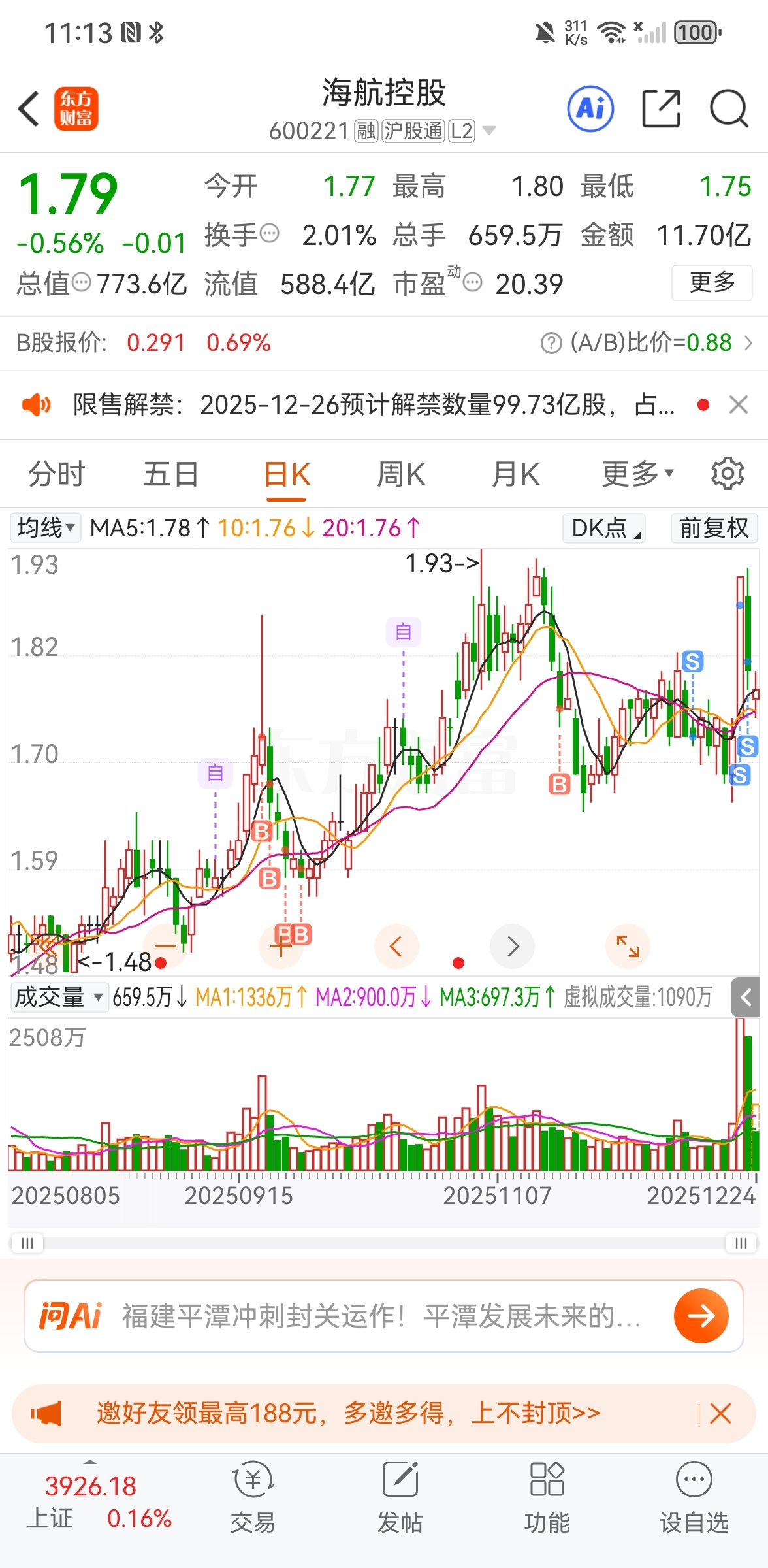 $海航控股(SH600221)$ 昨天基本全出了,还留了4000股,做个纪念吧