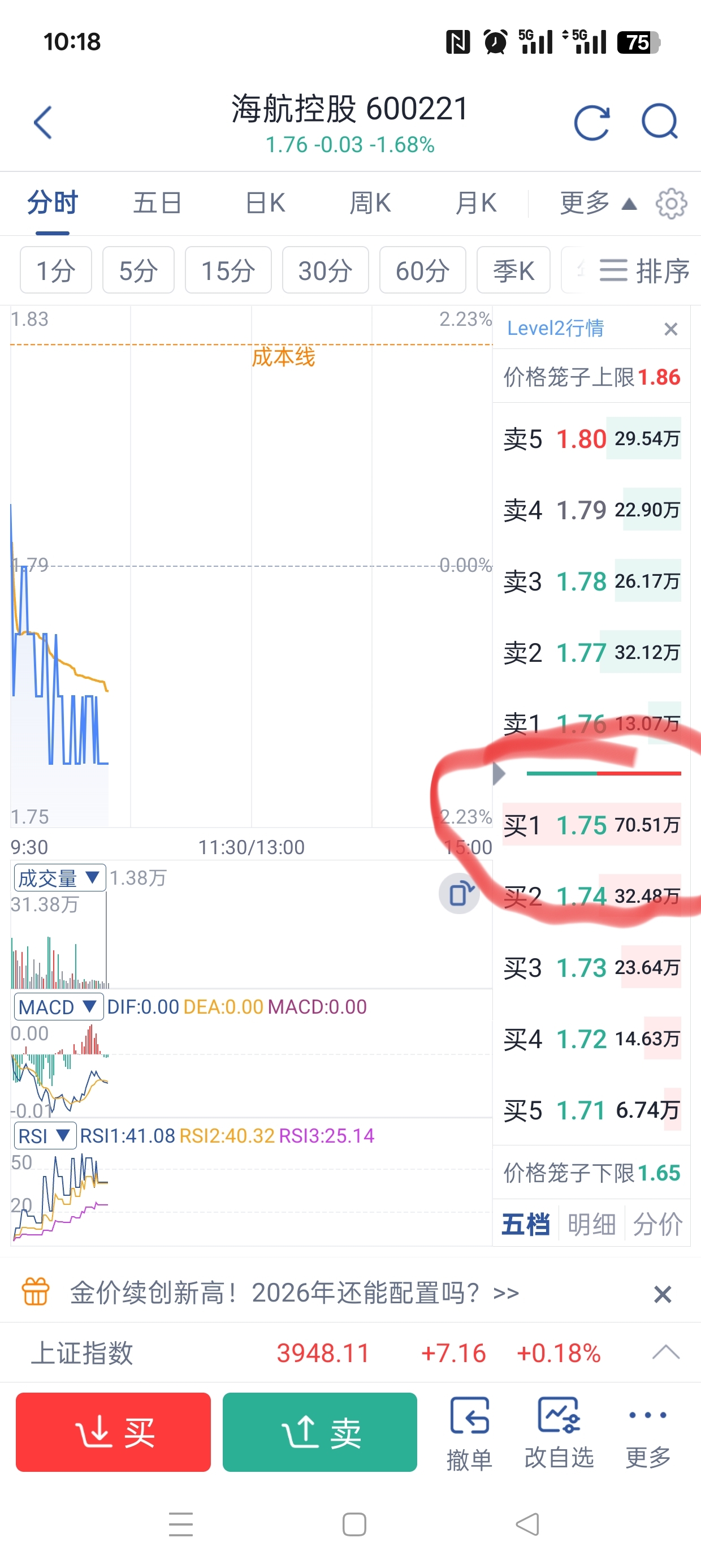$海航控股(SH600221)$ 庄家看到这么多承接就爽了。今天收盘1.75