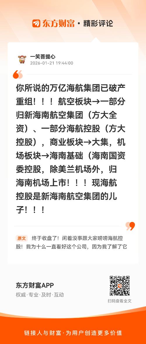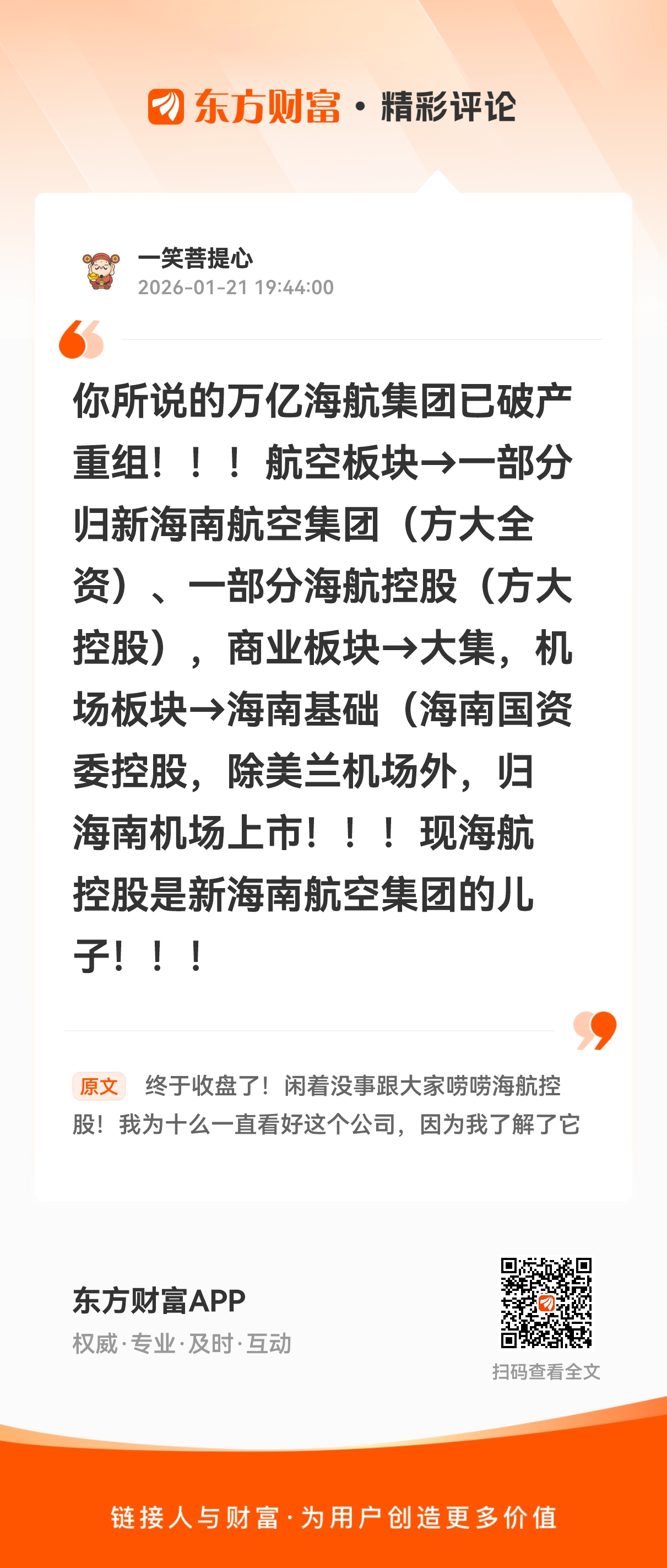你所说的万亿海航集团已破产重组!!!航空板块→一部分归新海南航空集团(方大全资)、一部分海航控股(方大控股),商业板块→大集,机场板块→海南基础(海南国资委控股,除美兰机场外,归海南机场上市!!!现海航控股是新海南航空集团的儿子!!! 我在《终于收盘了!闲着没事跟大家唠唠海航控股!我为十么一直看好这个公司,因为我了解了它》的评论获得了大家的关注。